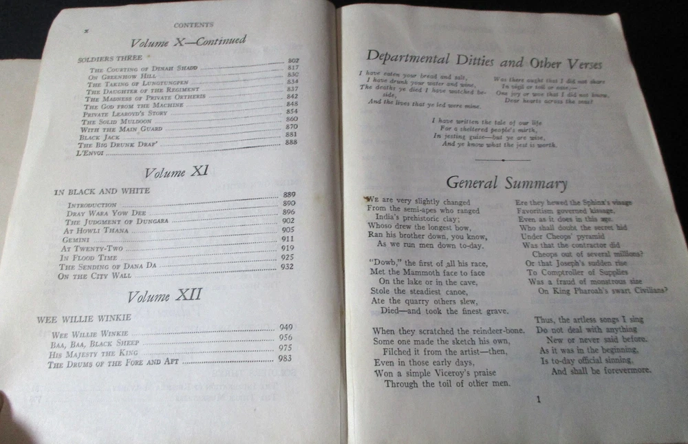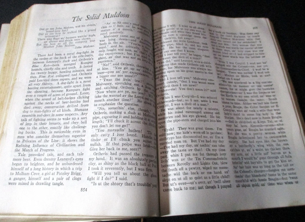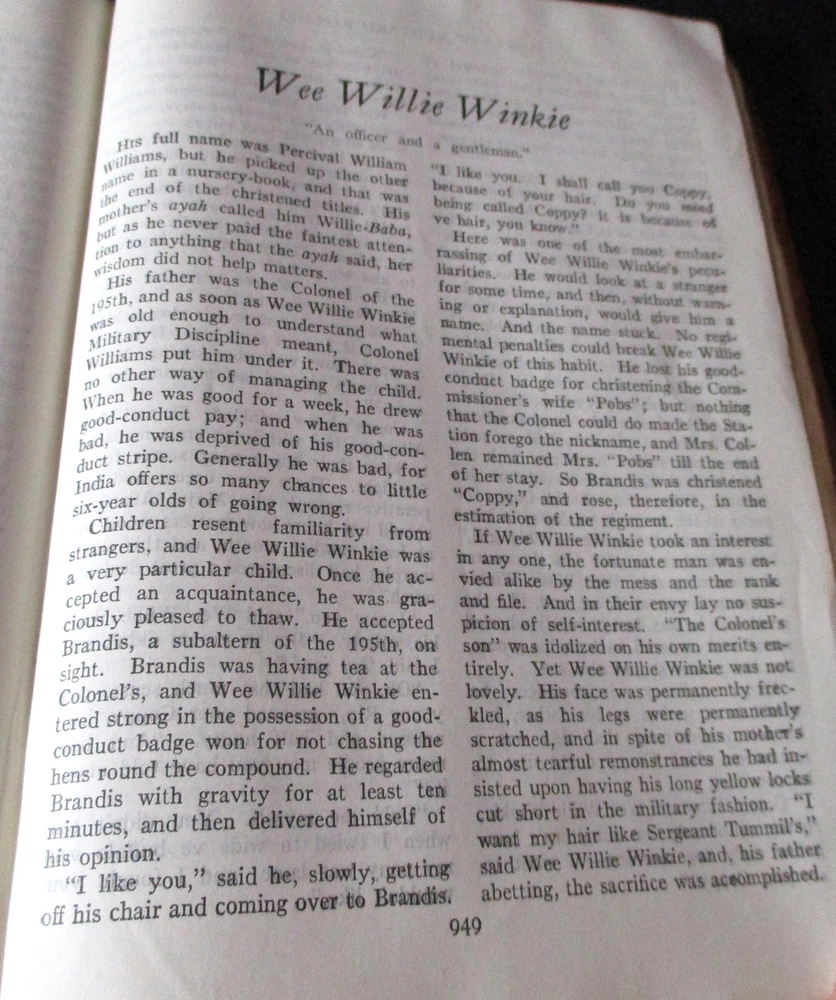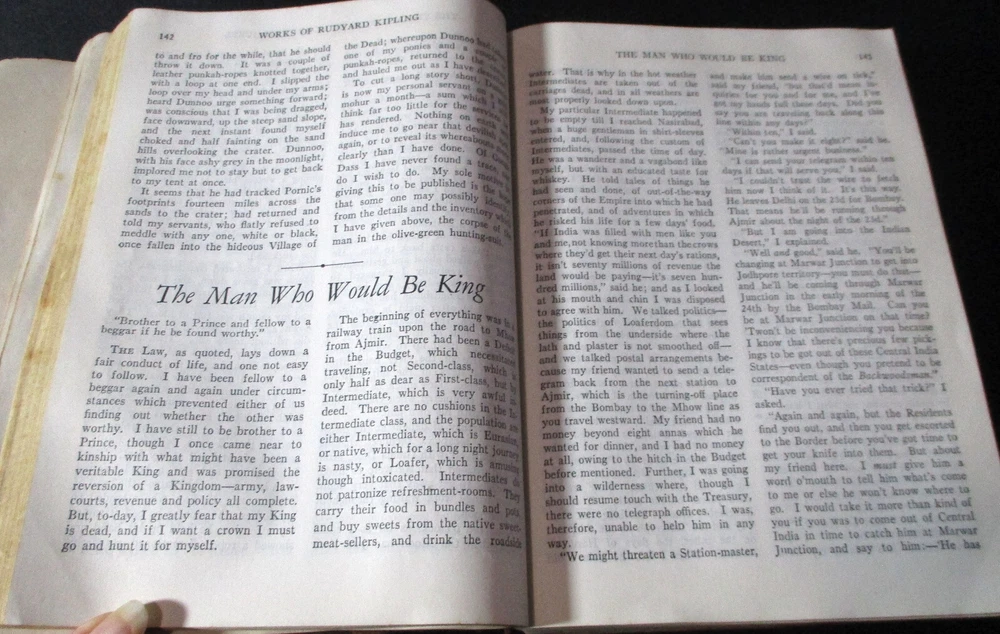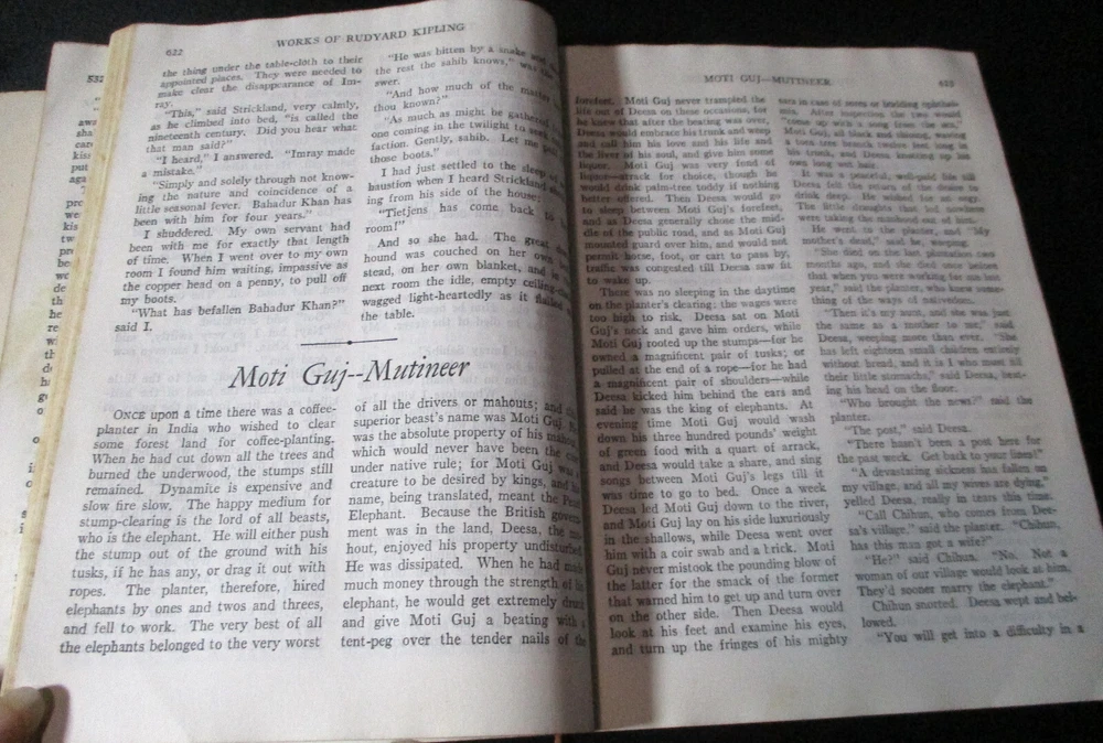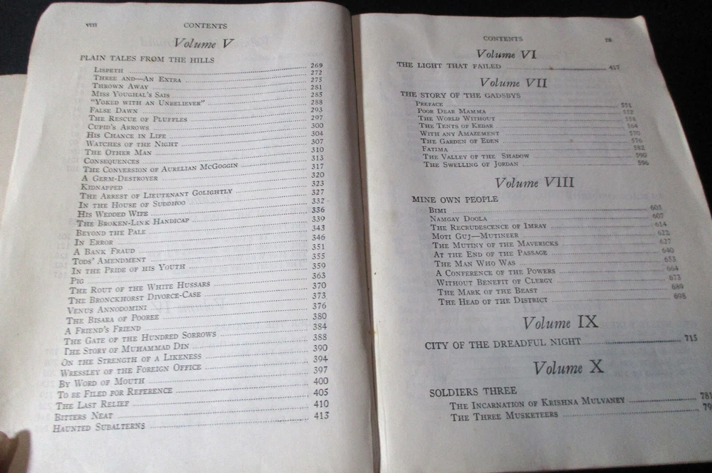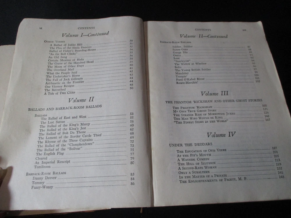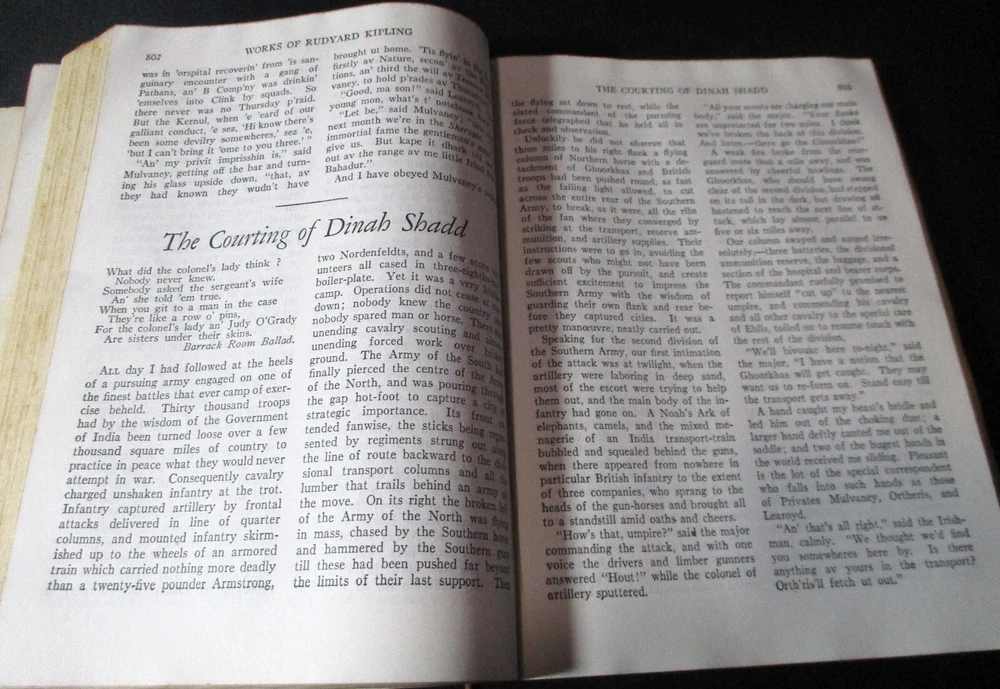 The Works of Rudyard Kipling One Volume Edition 1933 is only date shows with gift inscription on endpaper Published by Walter J. Black, NY Tooled leather bookcover with handles shows some age and wear 1933 is only date shows with gift inscription on endpaper, intact text block has come free of leather backing, but for front endpaper attached to front cover w/ same kind of separation in back--because of this book comes with a tooled leather book cover to keep all together. No writing, minor age discoloration except for heaviest shown in one image Soft leather - 1004 pgs - 5 x 7 1/4