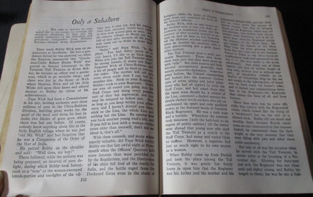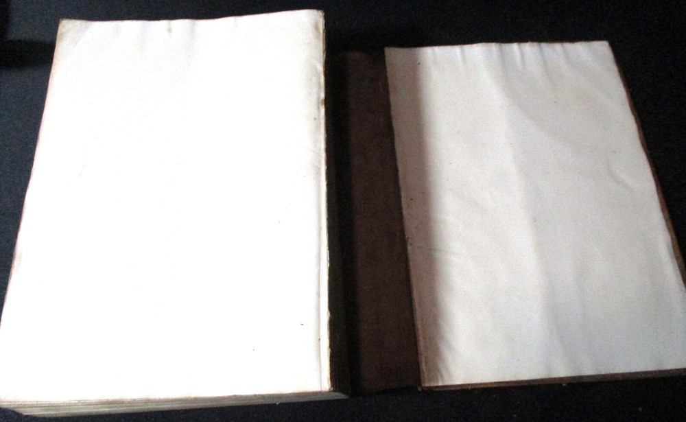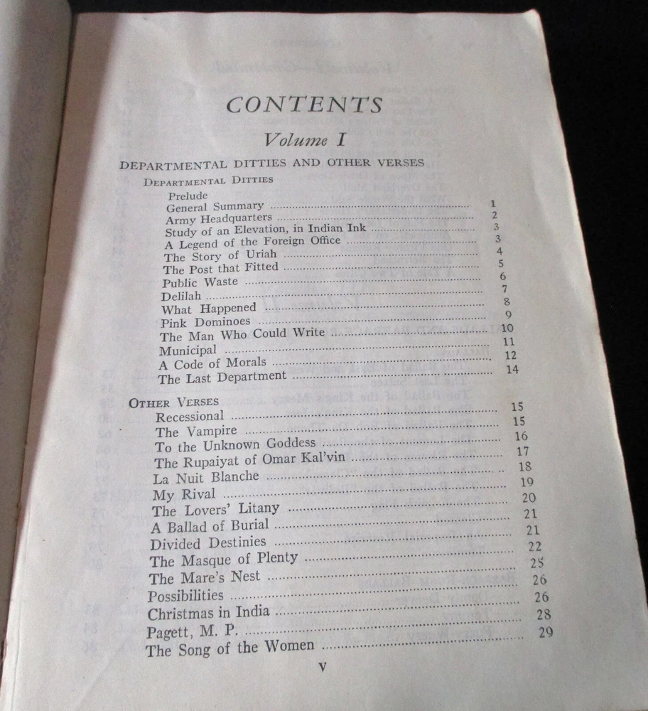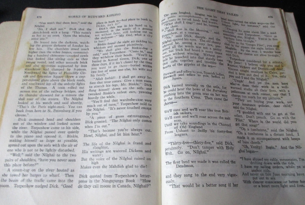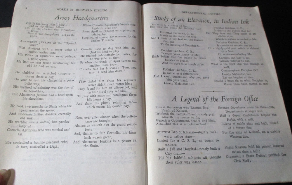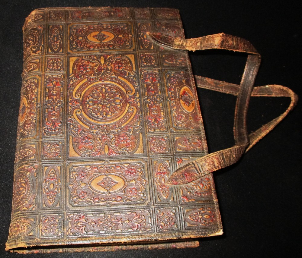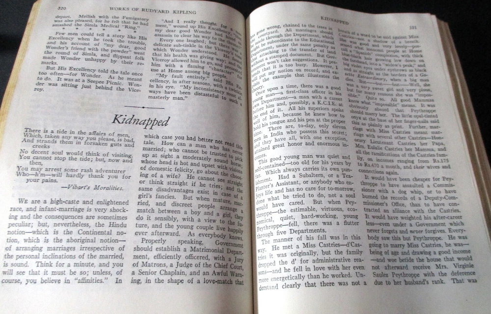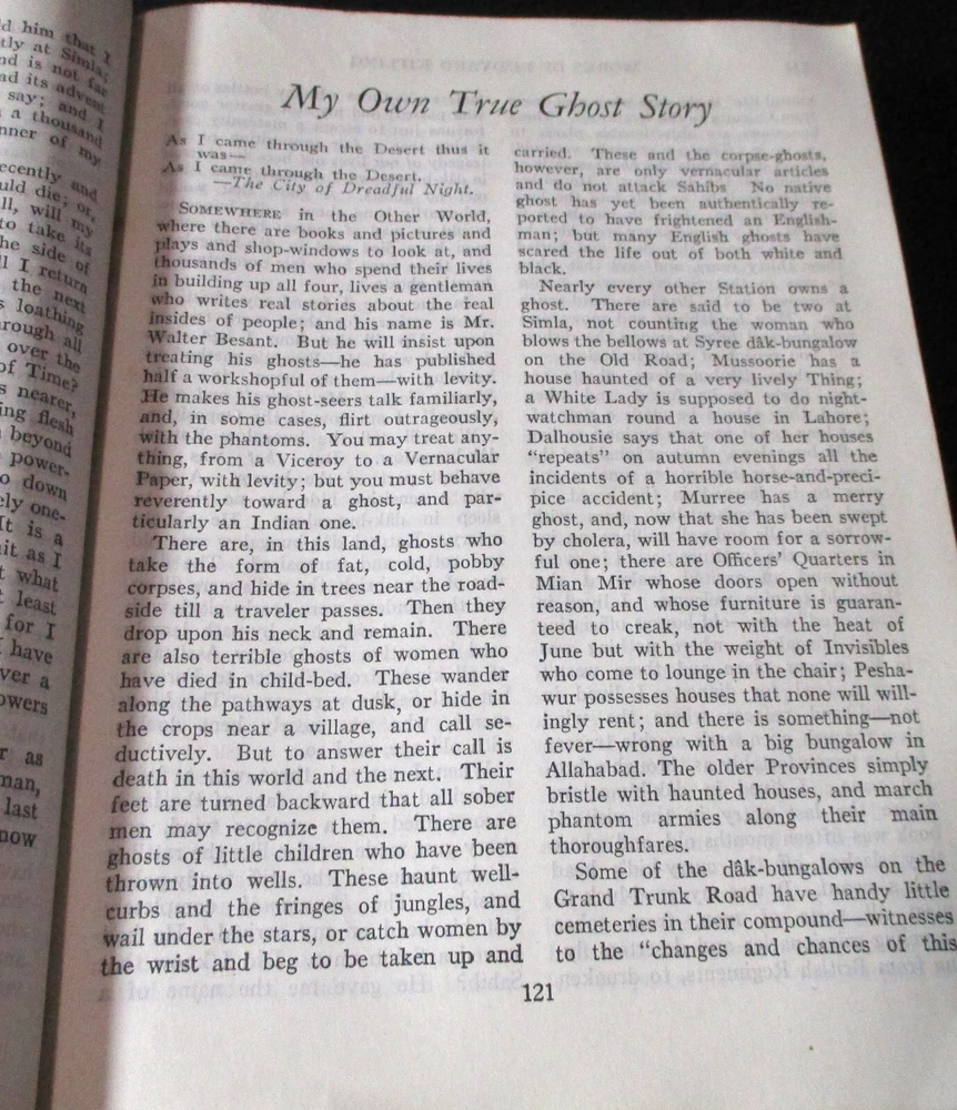 The Works of Rudyard Kipling One Volume Edition 1933 is only date shows with gift inscription on endpaper Published by Walter J. Black, NY Tooled leather bookcover with handles shows some age and wear 1933 is only date shows with gift inscription on endpaper, intact text block has come free of leather backing, but for front endpaper attached to front cover w/ same kind of separation in back--because of this book comes with a tooled leather book cover to keep all together. No writing, minor age discoloration except for heaviest shown in one image Soft leather - 1004 pgs - 5 x 7 1/4