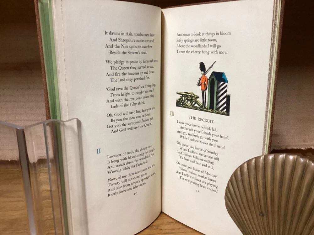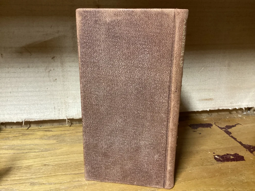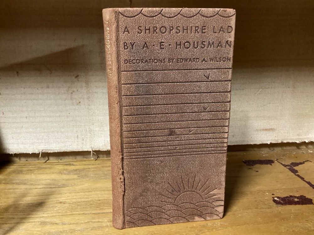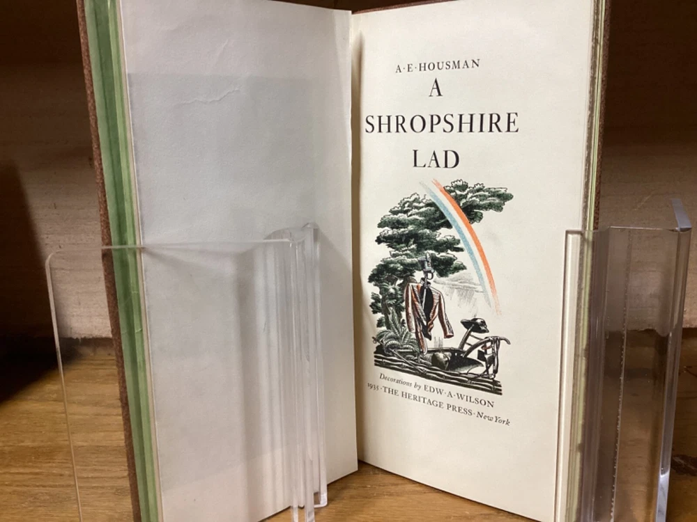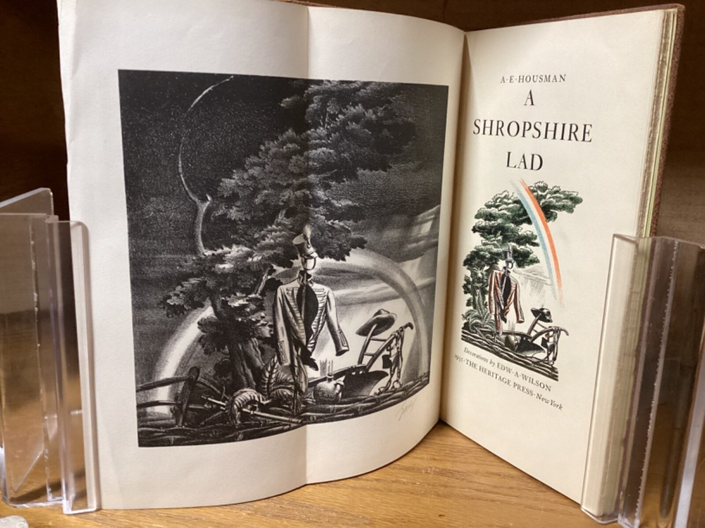A Shropshire Lad. By A.E. Housman and printed in New York City by the Heritage Press. 1935, 73 pp, 10” x 5.25”. Full leather hardcover. Overall good, with rubbing and wear to boards, primarily along edges and corners. Some cracking to hinges at front and rear of text block. Foldout at front and signed by Wilson at bottom. Lack of dust jacket, if issued. Nicely illustrated with an assortment of small color illustrations throughout. General age-related toning to pages, along with periodic foxing and wear. Please see photographs and ask any questions prior to purchasing. A scarce edition of A.E. Housman’s collection of poetry, having first been published in 1896. Edward A. Wilson (1886-1970) was an American artist and illustrator, with many of his most popular works created for books and magazines. COLL1935ABCC-0724-aj1904