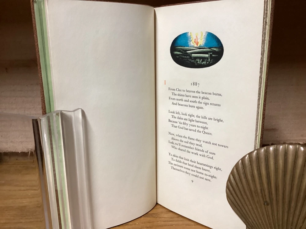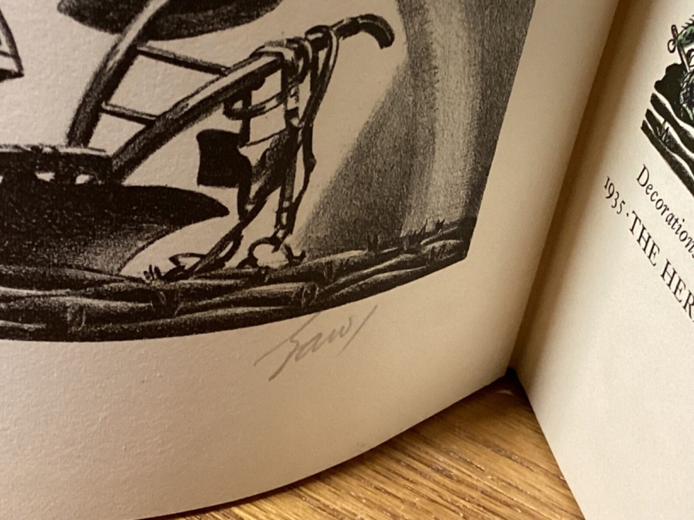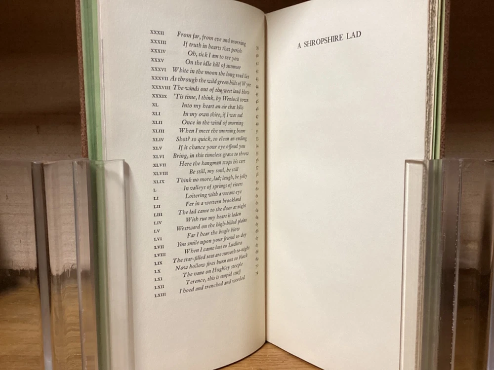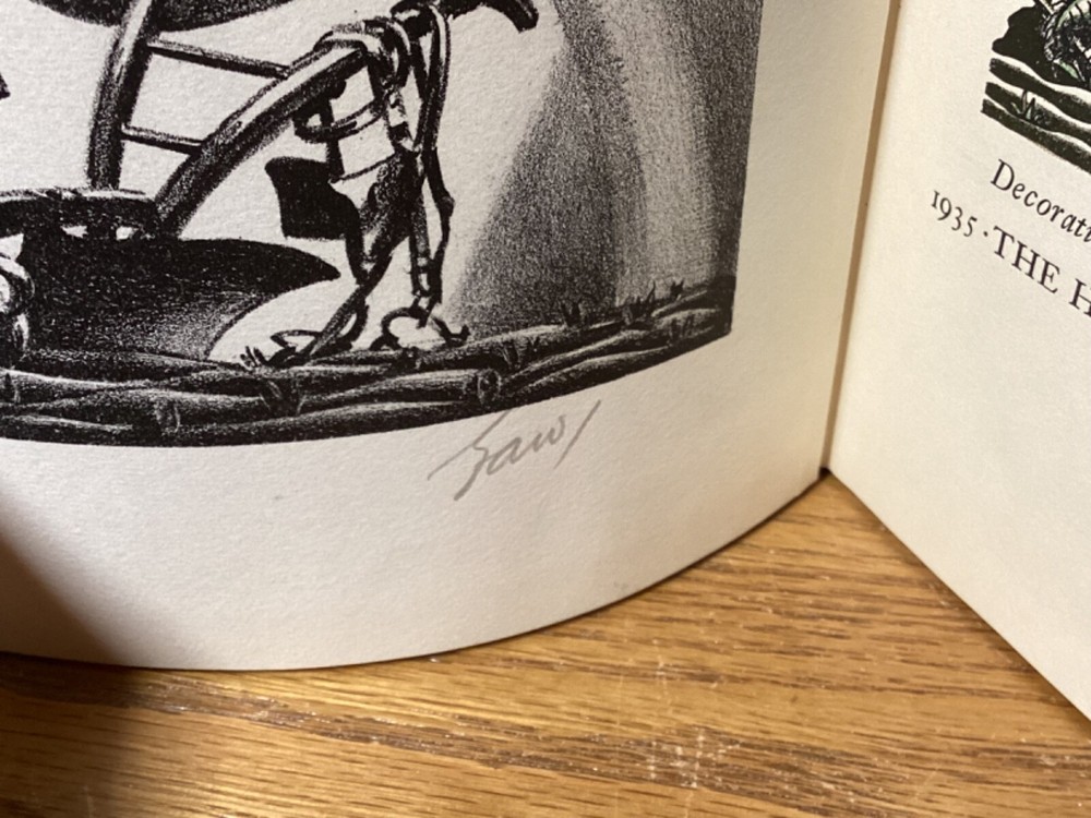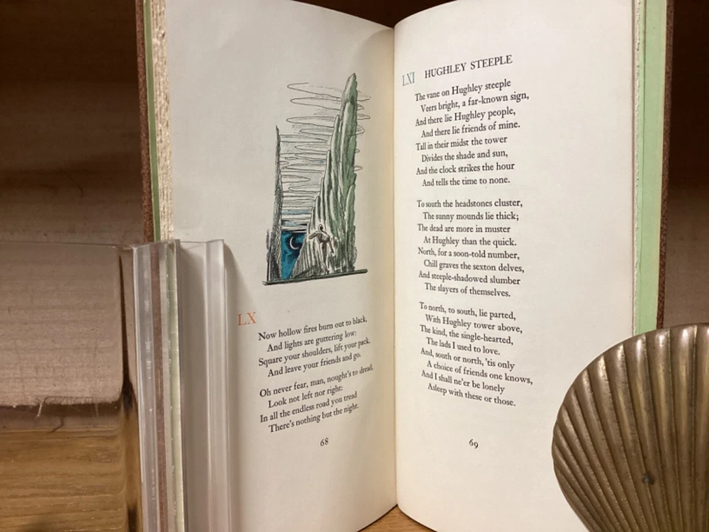 A Shropshire Lad. By A.E. Housman and printed in New York City by the Heritage Press. 1935, 73 pp, 10” x 5.25”. Full leather hardcover. Overall good, with rubbing and wear to boards, primarily along edges and corners. Some cracking to hinges at front and rear of text block. Foldout at front and signed by Wilson at bottom. Lack of dust jacket, if issued. Nicely illustrated with an assortment of small color illustrations throughout. General age-related toning to pages, along with periodic foxing and wear. Please see photographs and ask any questions prior to purchasing. A scarce edition of A.E. Housman’s collection of poetry, having first been published in 1896. Edward A. Wilson (1886-1970) was an American artist and illustrator, with many of his most popular works created for books and magazines. COLL1935ABCC-0724-aj1904