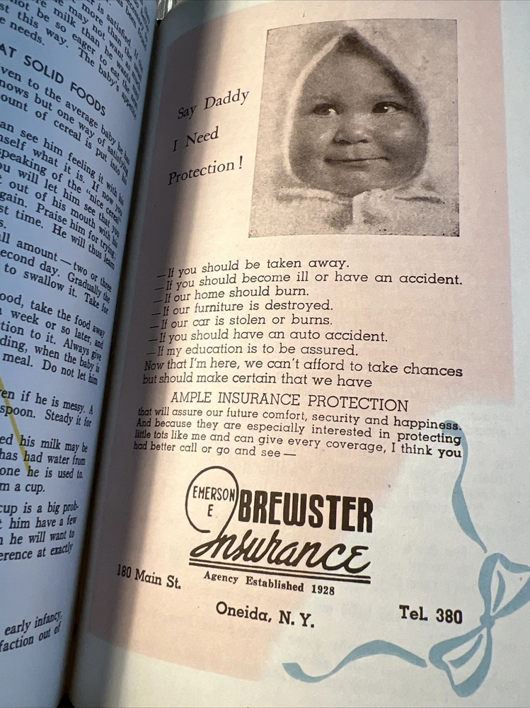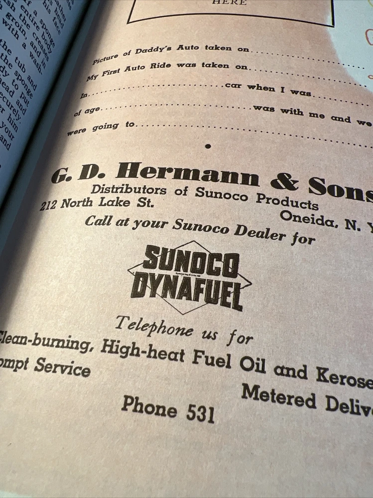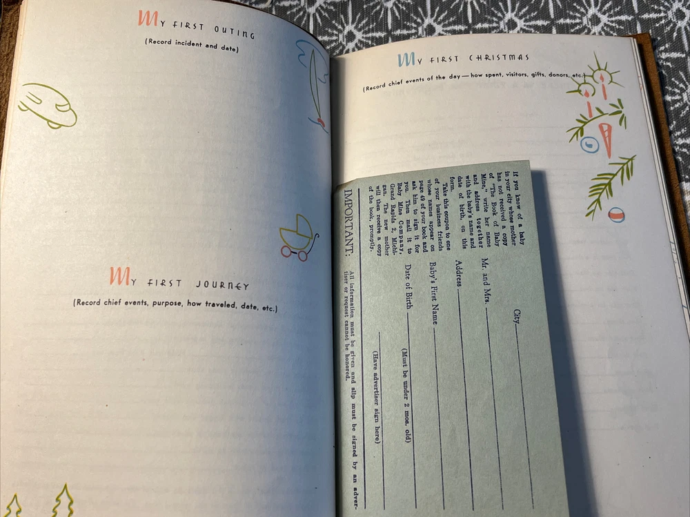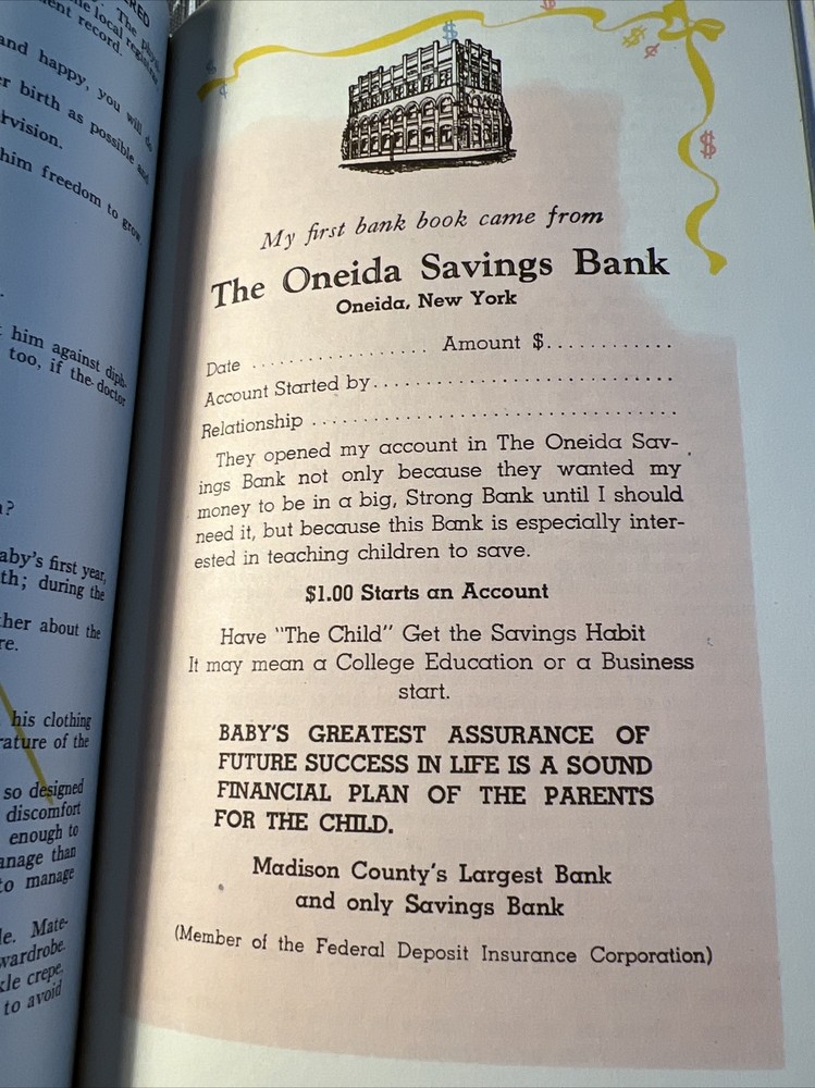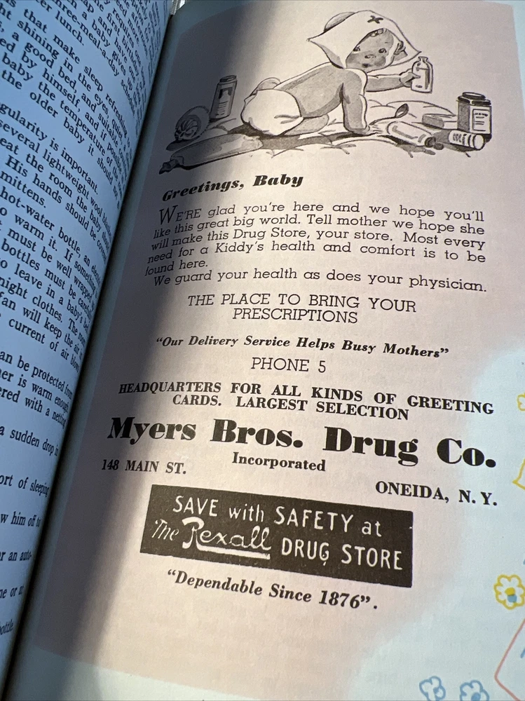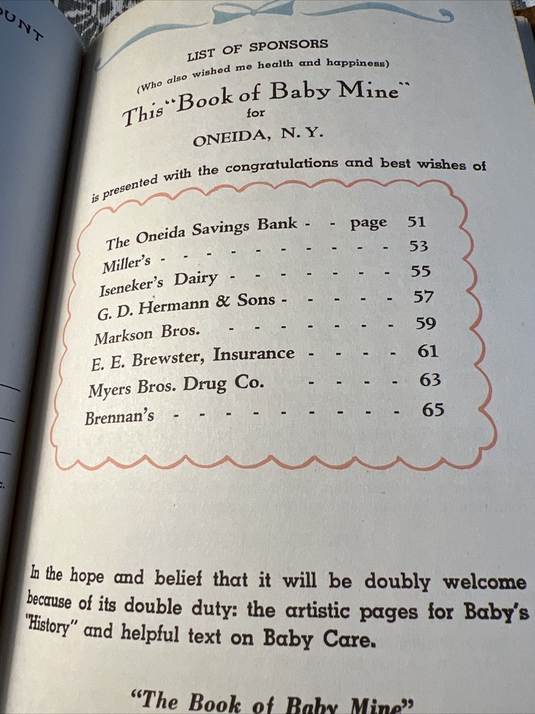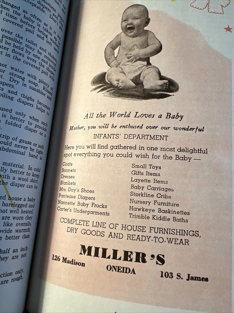 Great 1947 journal/ledger from Oneida, New York. Measures 8 1/2” x 5 1/2”. 93 pages of great ads, graphics and spaces for baby’s and family information. “Theresa” in gold on the front. Please review photos carefully for condition and details. Feel free to ask any questions you may have before bidding. Vintage paper items are sold as is. Thank you so much!!