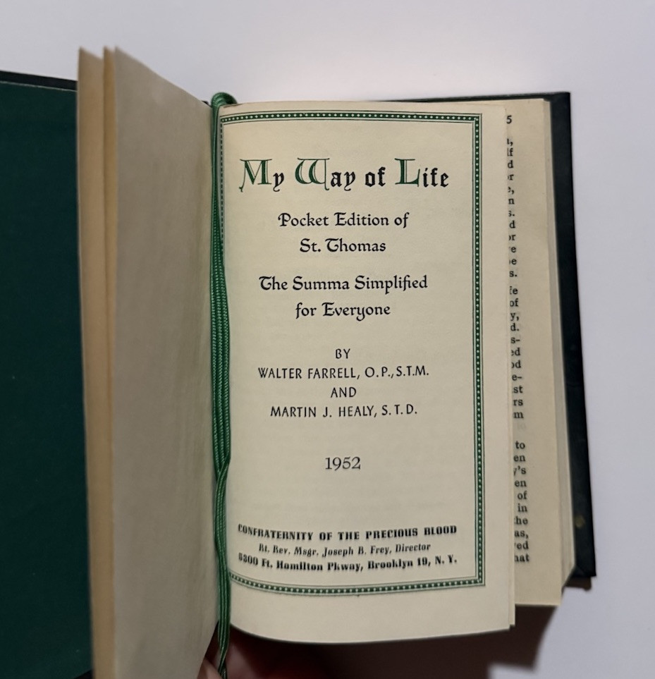 Delve into the pages of "My Way of Life," a vintage collectible that beckons readers with its religious wisdom and timeless teachings. Authored by Walter Farrell, this pocket edition from 1952 is a testament to the spiritual reflections of an era, bound in a supple leather cover that speaks of its historical value.