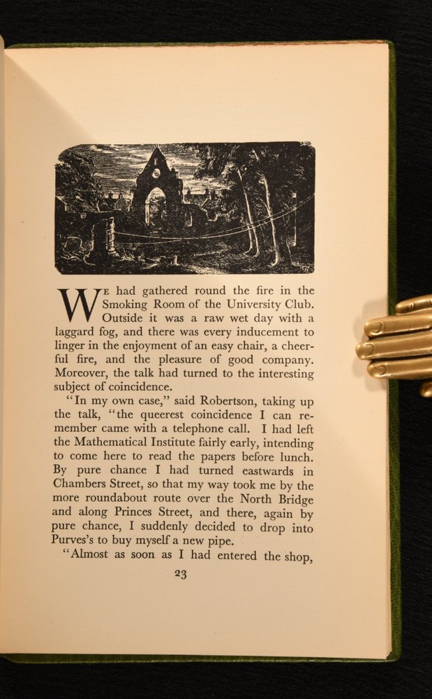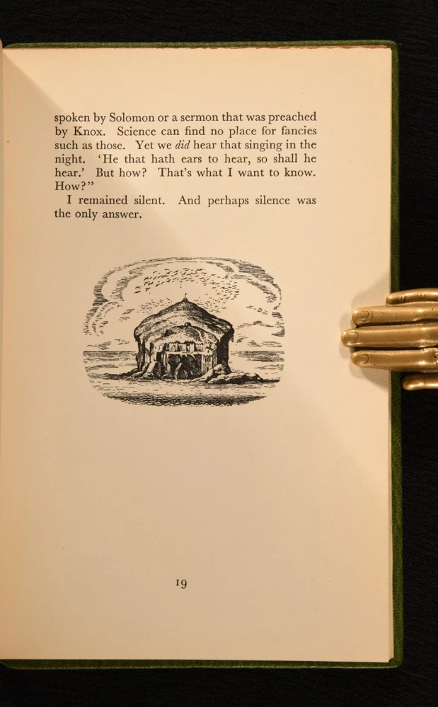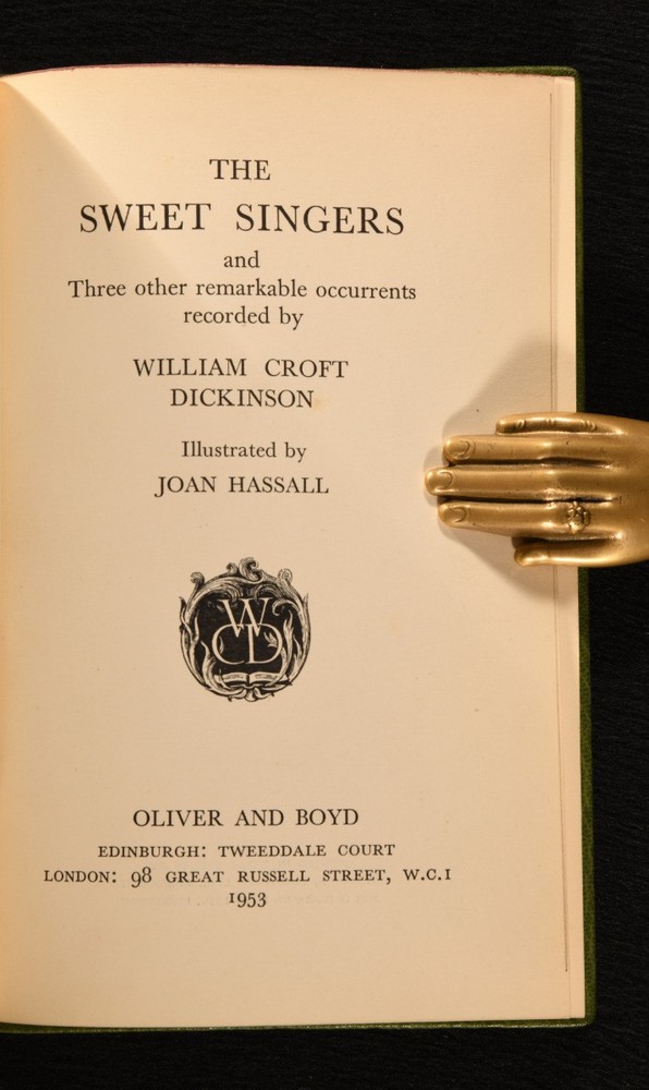 Click here to see our other books! The Sweet Singers William Croft Dickinson 1953 Oliver and Boyd : Edinburgh 7.5" by 5" 80pp. SUMMARY A strikingly bound, first edition of William Croft Dickinson's anthology of four ghost stories, with illustrations by Joan Hassall. First Edition,Illustrated,Leather Binding,Uncommon Overall Condition: Near Fine This book weighs 0.5 KG when packed UK Postage: £ 3.99 US Postage: £ 15.99 EU Postage : £ 13.99 European Postage: £ 14.99 Asia Postage: £ 18.99 Worldwide Postage: £ 19.99 DESCRIPTION The first edition, first impression. Uncommon work. Beautifully bound in full crushed morocco with a striking gilt motif. An anthology of four short ghost stories, including 'The Sweet Signers', 'Can These Stones Speak?', 'The Eve of St. Botulph', and 'Return at Dusk'. Written by the leading scholar on early modern Scotland, William Croft Dickinson. Illustrated with in-text illustrations throughout by Joan Hassall. CONDITION Bound in full crushed morocco with gilt detailing. Externally, excellent, with minor fading to the spine and the odd light mark. Internally, firmly bound. Pages are bright and clean. Overall Condition: Near Fine GLOSSARY OF TERMS Overall Condition (Dustwrapper condition rating is shown after that for the book itself, where a dustwrapper is present) Fine - Very well preserved copy showing very little wear Very Good Indeed - Only one or two minor faults, really a very attractive copy Very Good - Quite a wide term meaning no major faults but probably several smaller ones often expected given the age of the book, but still a respectable copy Good - Meaning not very good. Some more serious faults as will be described in the condition report under 'condition' Good Only - Meaning one or more faults that could really do with repair Fair - As with good only above but with other faults leaving a compromised copy even after repair Poor - Really bad and possibly seriously incomplete. We only sell books in this condition where their rarity or value makes them attractive none the less. Major defects will be described. GUARANTEE We offer a full money back guarantee on our descriptions. Please ask for details and conditions. We prefer PAYPAL. If you pay via PAYPAL we will post the item off the same or the next working day with the postage you have selected. Please note we cannot accept USD cheques