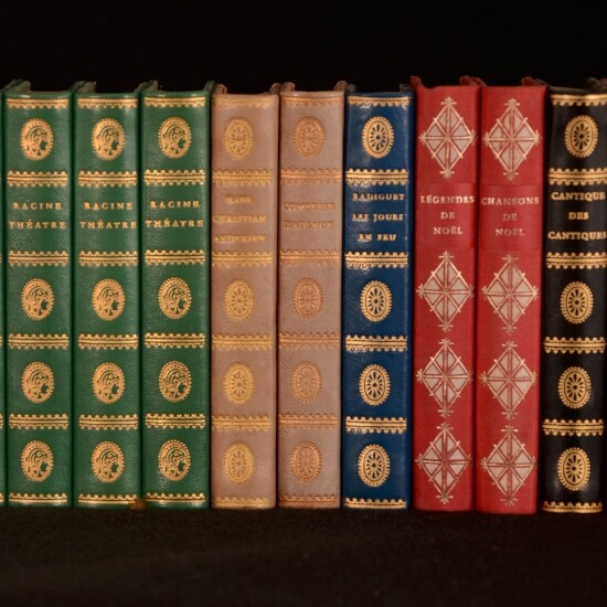 Click here to see our other books! arious French Works of Fiction and Non-Fiction From Le Livre de Chevet Various 1960-1975 Claude Tchou, Le Livre de Chevet : Paris 5" by 3" SUMMARY An extremely attractive collection of a wide range of pocket sized French works from 'Le Livre de Chevet.' Decorative Binding,Early Edition,Illustrated,Leather Binding,Pleasing Copy Overall Condition: Fine This book weighs 1 KG when packed UK Postage: £ 3.99 US Postage: £ 22.99 EU Postage : £ 16.99 European Postage: £ 17.99 Asia Postage: £ 22.99 Worldwide Postage: £ 28.99 DESCRIPTION A wide range of pocket sized works. From palm readings and zodiacs, to poetry and philosophy, this set is an eclectic yet attractive addition to any library. The works present are as follows: Contes by Contesse D'Aulnoy Le Langage des Fleurs by Claude Tchou Theatre de Racine by Jean Racine (four volumes, Vols I - IV) Contes by Comtesse de Segur Contes by D'Anderson (Hans Christian Anderson) (Two volumes of the same text in different bindings) Contes by Perrault Lettres a Louis de Narbonne Adolphe de Ribbing et Benjamin Constant by Madame de Stael Chansons Paroles de Jacques Lanzmann et de Anne Segalen by Jacques Dutronc Contes by Aulnoy Les Signes Du Zodiaque by Conrad Moricand La Nuit Obscure de L'Ame by Saint-Jean de La Croix Les Joues en Feu et Autres Poemes by Raymond Radiguet Chansons by Leo Ferre Les Lignes de La Main Le Chateau de L'Ame by Sainte Therese d'Avila Nouvelle Clef des Songes Poemes by Vigny Anthologie de La Poesie Francaise du XIXe Siecle by Jean Robert Masson Francois Mizrachi Lao-Tseu Tao-Te-King Tchouang Tseu Pensees Artine et Autres Poemes by Reme Char Les Fioretti de Saint Francois d'Assie Opera suivi de Des Mots de Mon Style by Jean Cocteau Dignes de Vivre Pouvoir Tout Dire by Paul Eluard Reflexions by Vauvenargues Legendes de Noel by Tchou Chants de Noel by Tchou Chansons by Jacques Brel Chansons et Poemes by Boris Vian Pensees by Marc Aurele Le Cantique Des Cantiques suivi Psaumes de David Chansons by Georges Brassens Maximes by La Rochefouauld. Plantes et Philtres Magiques by Tchou Plantes et drogues a Poison by Tchou Vignette illustrations to Le Langage des Fleurs, Cotesse de Segur Contes, Contes D'Anderson, Contes de Perrault, Les Signes du Zodiaque, Les Lignes de la Main, Nouvelle Clef des Songes, Plantes et Philtres Magiques and Plantes et drogues a poison. With a frontispiece to Radiguet's Les Joues, Taeo-Te King Tchouang Tseu, Artine et Autres Poems, Dignes de Vivre Pouvoir Tout Dire , Vauvenargues' Reflexions, Marc Aurele's Pensees and La Rouchefoucauld's Maximes. Illustrated title pages to every volume. With a colour illustration pasted to the front of one of the Hans Christian Anderson books and a gilt-stamped silhouette to front board of Madame de Stael's Lettres. All volumes are written in French. All of these volumes were published as a part of publisher Claude Tchou's book series 'Le Livre de Chevet' or bedside books. CONDITION In a combination of cloth, silk, and leather bindings. Externally, all volumes are in excellent with some very minor shelf wear. Some minor handling marks to some of the cloth-bound volumes as well as a small amount of bumping to the head and tail of spines. Contes by D'Anderson has some fading to the gilt, particularly the front board. Internally, all volumes are firmly bound. Pages are bright and clean throughout. Ribbon bookmarks are present in all volumes. Overall Condition: Fine GLOSSARY OF TERMS Overall Condition (Dustwrapper condition rating is shown after that for the book itself, where a dustwrapper is present) Fine - Very well preserved copy showing very little wear Very Good Indeed - Only one or two minor faults, really a very attractive copy Very Good - Quite a wide term meaning no major faults but probably several smaller ones often expected given the age of the book, but still a respectable copy Good - Meaning not very good. Some more serious faults as will be described in the condition report under 'condition' Good Only - Meaning one or more faults that could really do with repair Fair - As with good only above but with other faults leaving a compromised copy even after repair Poor - Really bad and possibly seriously incomplete. We only sell books in this condition where their rarity or value makes them attractive none the less. Major defects will be described. GUARANTEE We offer a full money back guarantee on our descriptions. Please ask for details and conditions. We prefer PAYPAL. If you pay via PAYPAL we will post the item off the same or the next working day with the postage you have selected. Please note we cannot accept USD cheques