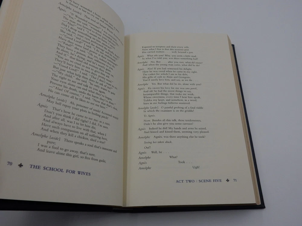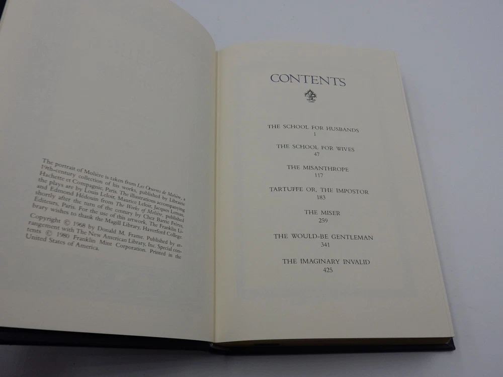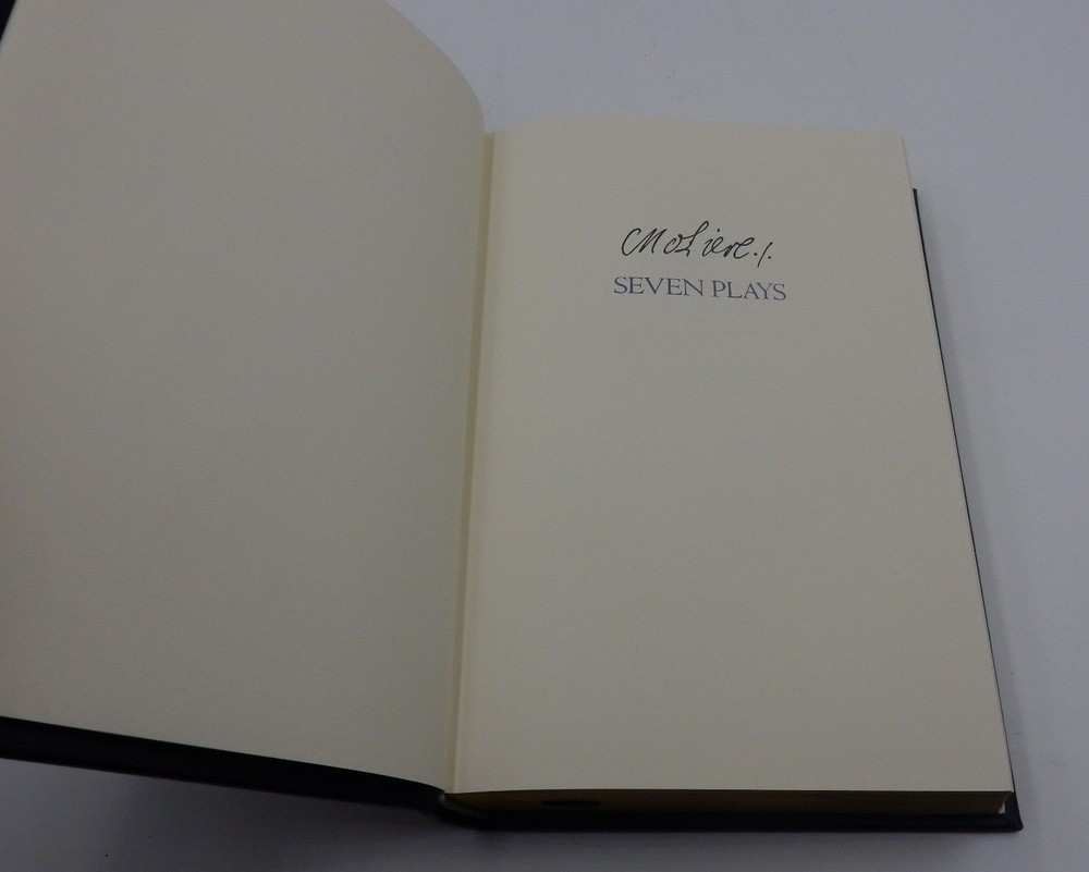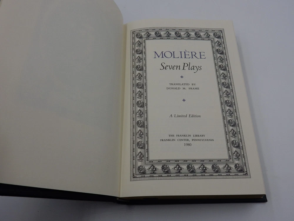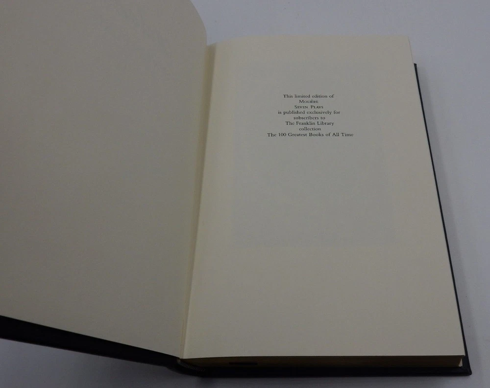 1980 MOLIERE, PLAYS - THE FRANKLIN LIBRARY - 100 GREATEST BOOKS - LIMITED EDITION THIS BOOK IS FROM THE FRANKLIN LIBRARY COLLECTION OF THE 100 GREATEST BOOKS OF ALL TIME IT IS LEATHER BOUND AND LIMITED EDITION FROM THE FRANKLIN LIBRARY . IT CONTAINS NO STAINS OR TEARS, ONLY A MINOR SUBTLE MARK OR TWO AT MOST ON THE PAGES. THE HARDCOVER DOES DISPLAY SOME GENERAL WEAR NEAR THE ENDS & CORNERS BECAUSE IT WAS KEPT IN STORAGE WITH THE OTHER "100 GREATEST BOOKS" THE WEAR ON THE HARDCOVER IS SIMPLY FROM STORAGE. THE SIDES OF THE PAGES SHOW A COUPLE EXTREMELY SUBTLE FADING SPOTS. A MARK ON THE HARDCOVER CAN BE FOUND (FINAL PHOTO) THE BOOK FEATURES A HANDY RIBBON PAGE MARKER! THE MOMENT YOU OPEN THE BOOK YOU WILL BE GREETED BY THE COLORED FAKE WOOD PAGE. THIS BOOK IS GENUINE QUALITY BOOK DIMENSIONS 9-3/8" LENGTH 6-1/2" WIDTH 1-5/8" THICK SOLD AS IS PLEASE VIEW ALL OF OUR PHOTOGRAPHS AS THEY REFLECT THE EXACT CONDITION OF THE ITEM IF THERE ARE ANY QUESTIONS, PLEASE FEEL FREE TO ASK. THANK YOU.