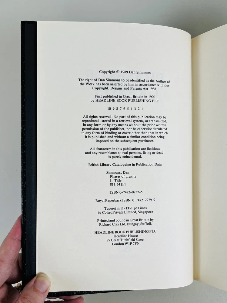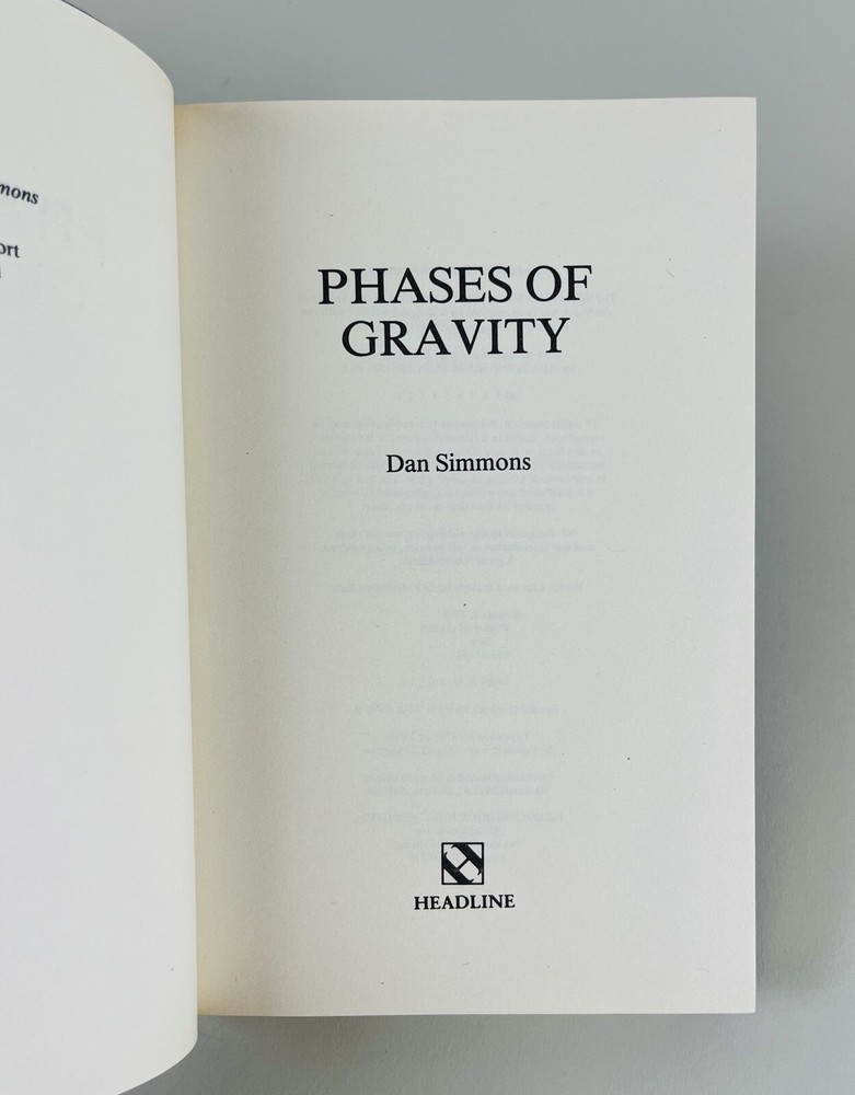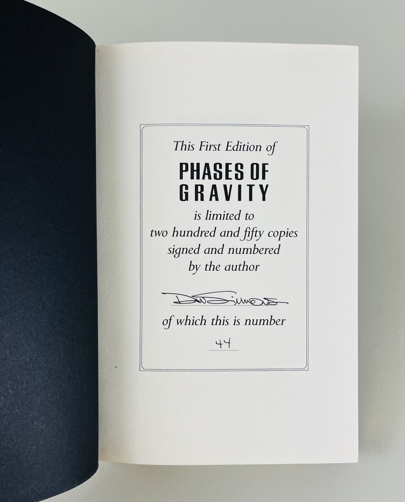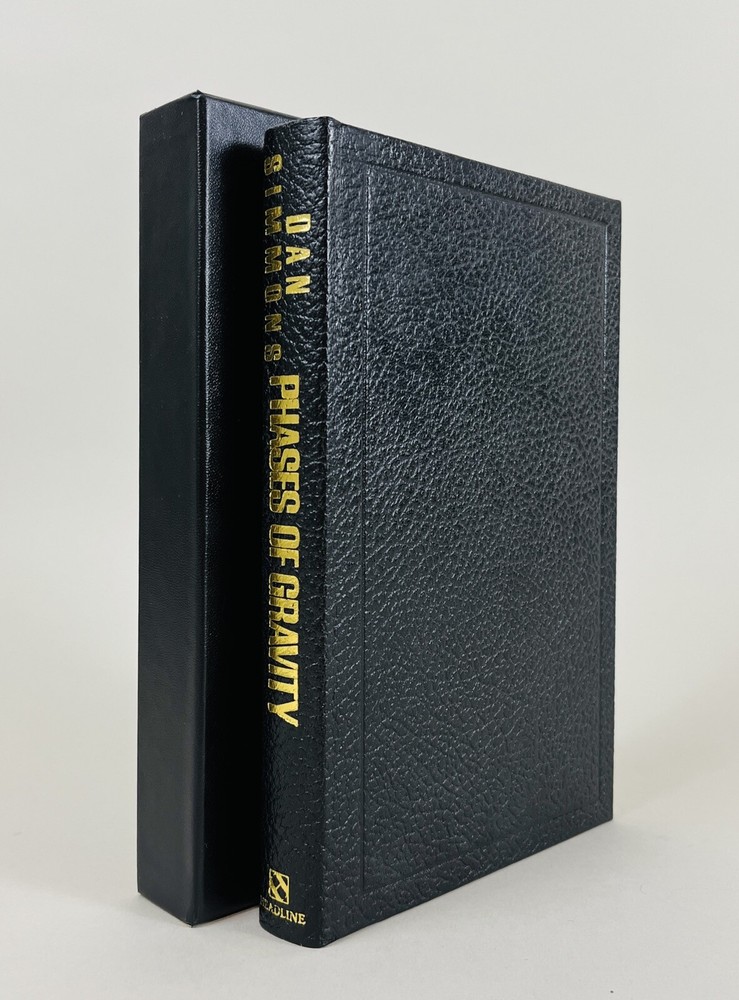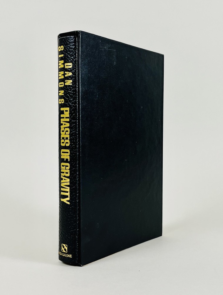 1990 SIGNED Ltd 1st ed Phases of Gravity #44/250 Headline, Dan Simmons Leather Phases of Gravity Dan Simmons London: Headline, 1990, First British and first hardcover edition Bound in full black leather, spine lettered in gilt, all edges gilt. No dust jacket as issued. Black paper slipcase. Signed and numbered by the author on the limitations page. This is number 44 of 250. A lovely copy from the library of noted Colorado collector Paul Harms. Condition: Book in fine condition. Slipcase is in very good condition, very clean with corners and seams intact. I will wrap and pack your purchase with care and ship promptly. I will combine shipping. Bin 2 _gsrx_vers_1710 (GS 9.9.1 (1710))