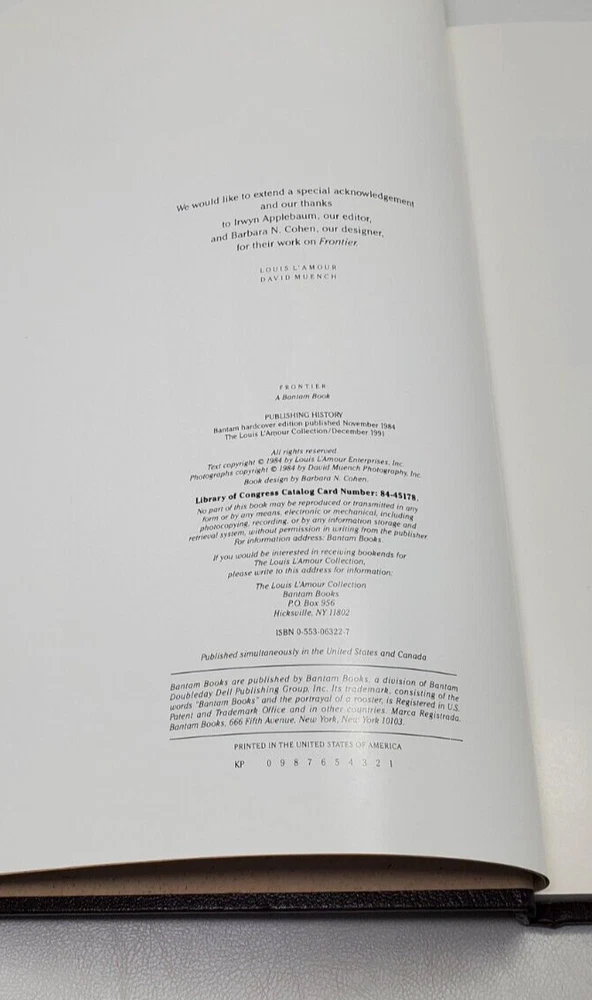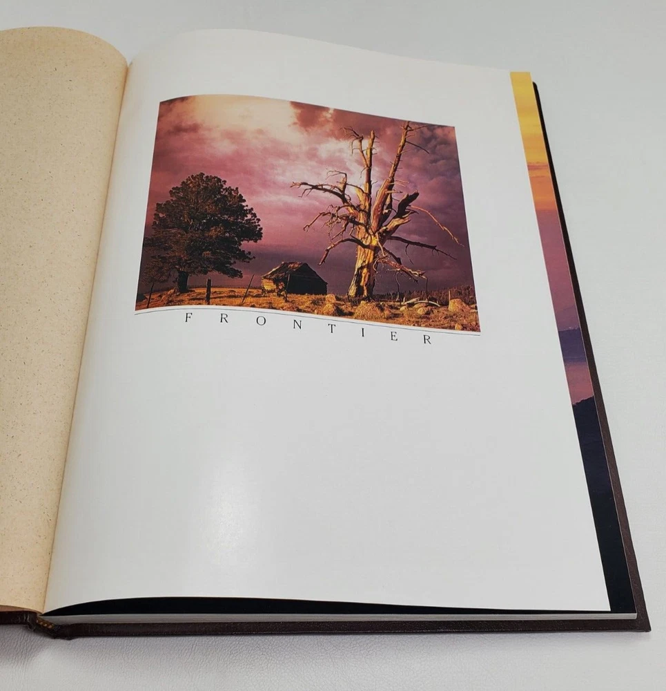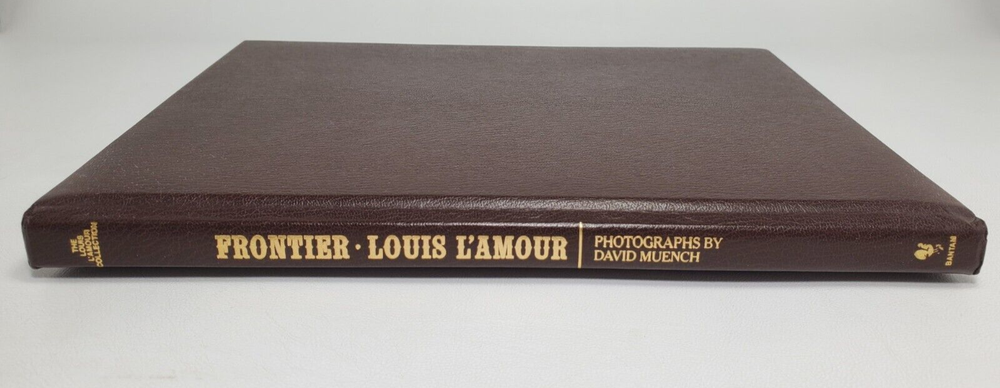 Up for consideration is this Louis L'Amour book titled "Frontier" that features photographs from David Muench. This leather bound book was published in 1991, and appears to be in near mint condition. There is one small scuff that is (shown in the photos) that would be tough to see without looking for it. The book measures in at roughly 9" x 12". This is the perfect addition to any Louis L'Amour collection! Thanks for looking. Feel free to reach out with any questions. Check out the other Louis L'Amour books on my page.