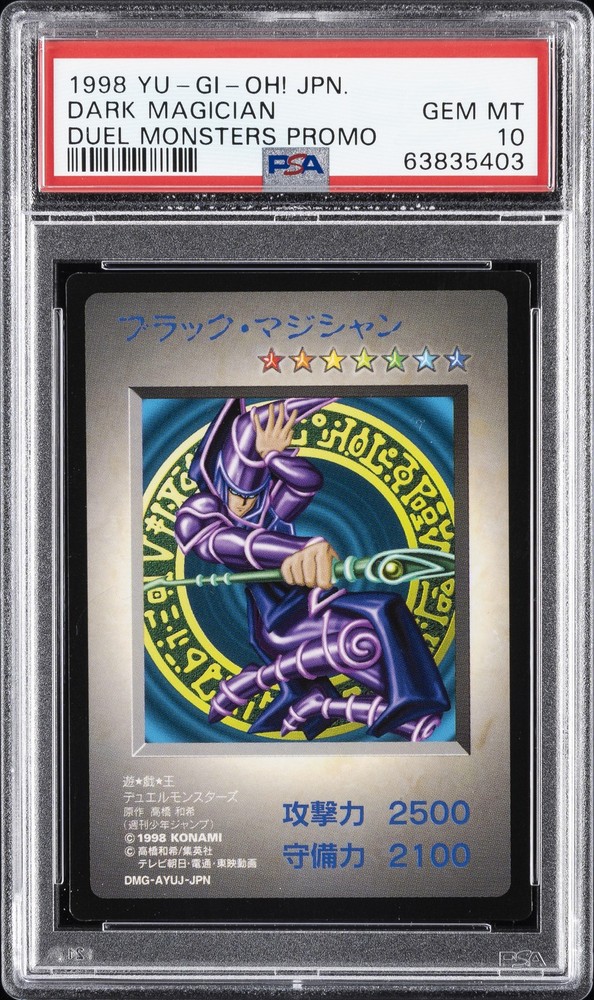 1998 YU-GI-OH! JAPANESE DUEL MONSTERS PROMO DARK MAGICIAN PSA 10 1998 YU-GI-OH! JAPANESE DUEL MONSTERS PROMO DARK MAGICIAN PSA 10 Purchase Info Thank you for your interest in this item consigned with PSA! By purchasing or making an offer on this item, you acknowledge and agree to the following terms: All sales are final. Returns not accepted. Payment must be made upon purchase of the item. All items are sold "as is" and without warranty of Collectors Universe, Inc. (d/b/a PSA), and ANY AND ALL IMPLIED WARRANTIES ARE DISCLAIMED AND EXCLUDED. Sales tax may apply depending on shipping address. PSA does not guarantee that another third-party grading company's authentication or certification of an item as genuine is correct or accurate. Neither a difference of opinion between third-party grading companies about authenticity, nor a company's subsequent reversal of its earlier authentication or certification of an item, will be a basis for rescinding a sale. Any dispute with another third-party grading company relating to the authenticity of an item must be resolved directly with that other company. Collectors' maximum liability in the event of loss or damage to an item during shipping will be the lesser of (a) the price paid for the item and (b) the change in fair market value of the item. You release Collectors from all other liability including for any claims of punitive damages, emotional distress, consequential damages, lost profits, or lost interest, except as prohibited by law. Shipping Purchased Items will be shipped directly from PSA Vault. You stay hands-free. PSA Vault When you purchase this item, you can save on sales tax and selling fees by keeping it in the PSA Vault, official Vault of eBay. Items already in PSA Vault and will be sent to PSA Vault will have no shipping charge Storage of any items with the PSA Vault will be subject to the PSA Vault Terms of Service. Consignment PSA has competitive rates on the world's largest collectibles marketplace with the option to list from the PSA Vault or immediately after PSA authentication and grading. Sale Price Under $100 $100 - $499 $500 - $999 $1,000 - $2,499 $2,500 - $4,999 $5,000+ Seller Fee 16% 14% 13% 10% 9% 7% Sellers pay a single fee as reflected above; no additional eBay fees are incurred. There is a $5 minimum fee on sold items.