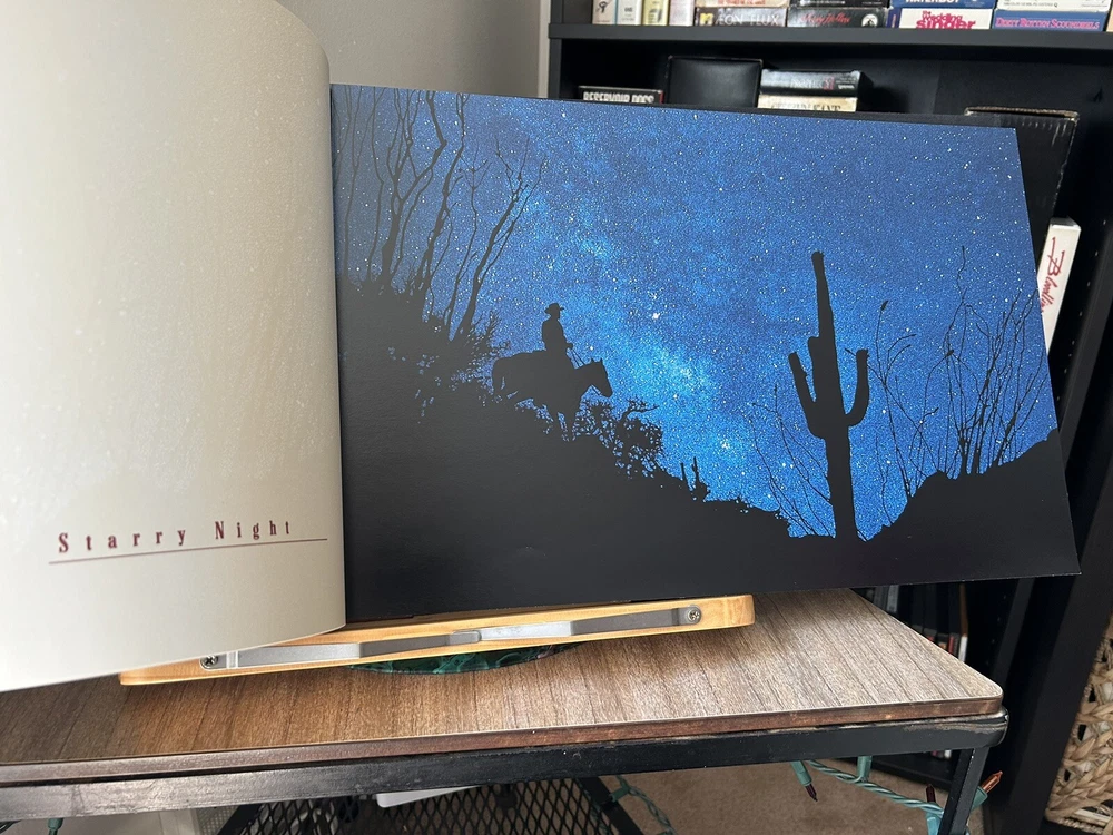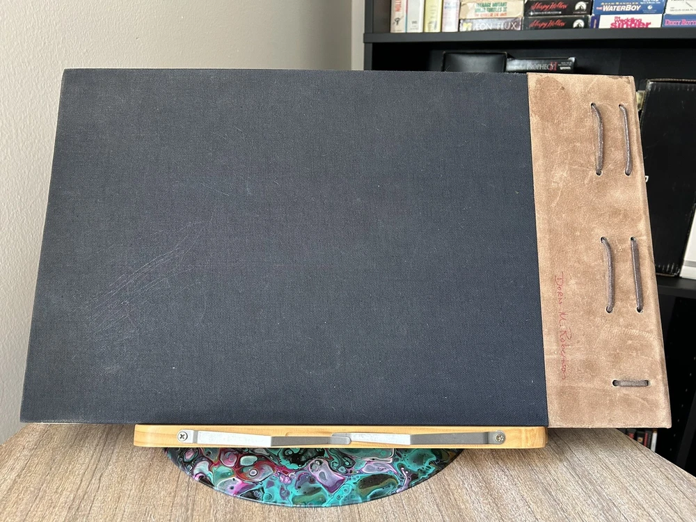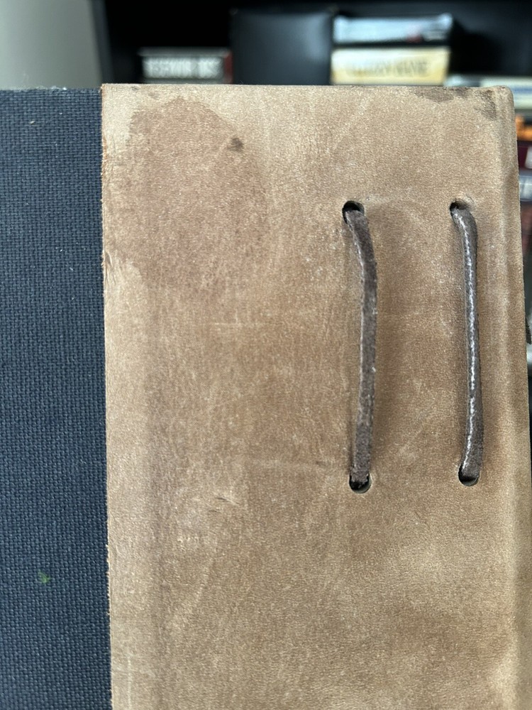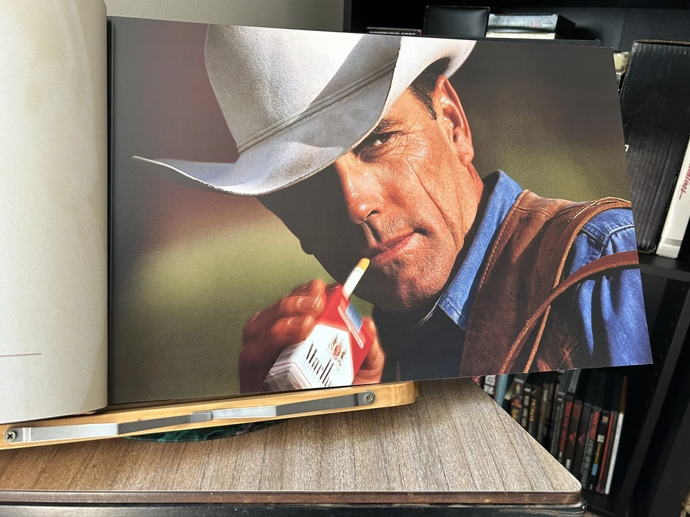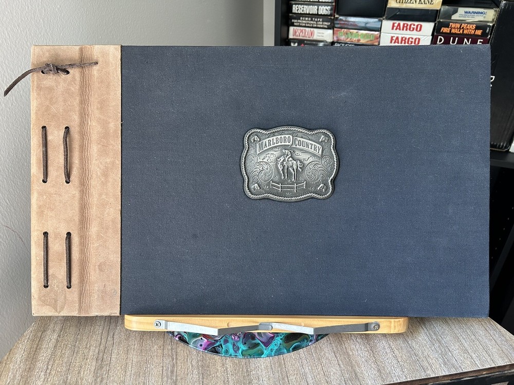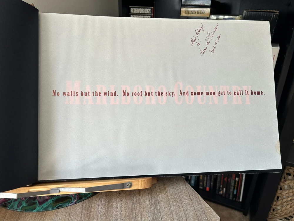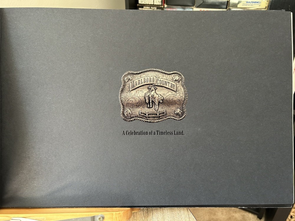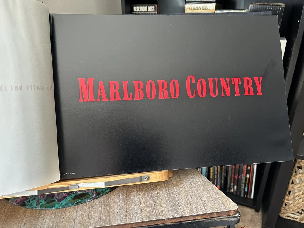 This limited edition hardcover photography book titled "Marlboro Country" is a vintage piece published in 1999 by Philip Morris Inc. It features leather-bound pages with illustrations and a buckle closure. The book’s dimensions are: length of 19 inches, a height of 11 inches, and a width of 1 inch. The book is in overall very good vintage condition, with no tears to the pages. The back cover and title page are inscribed with the original owner’s name. There is minor staining on the leather and page edges as shown in listing pictures. The book is a perfect addition to any collection and is a must-have for fans of vintage advertising and photography. Free shipping in USA.