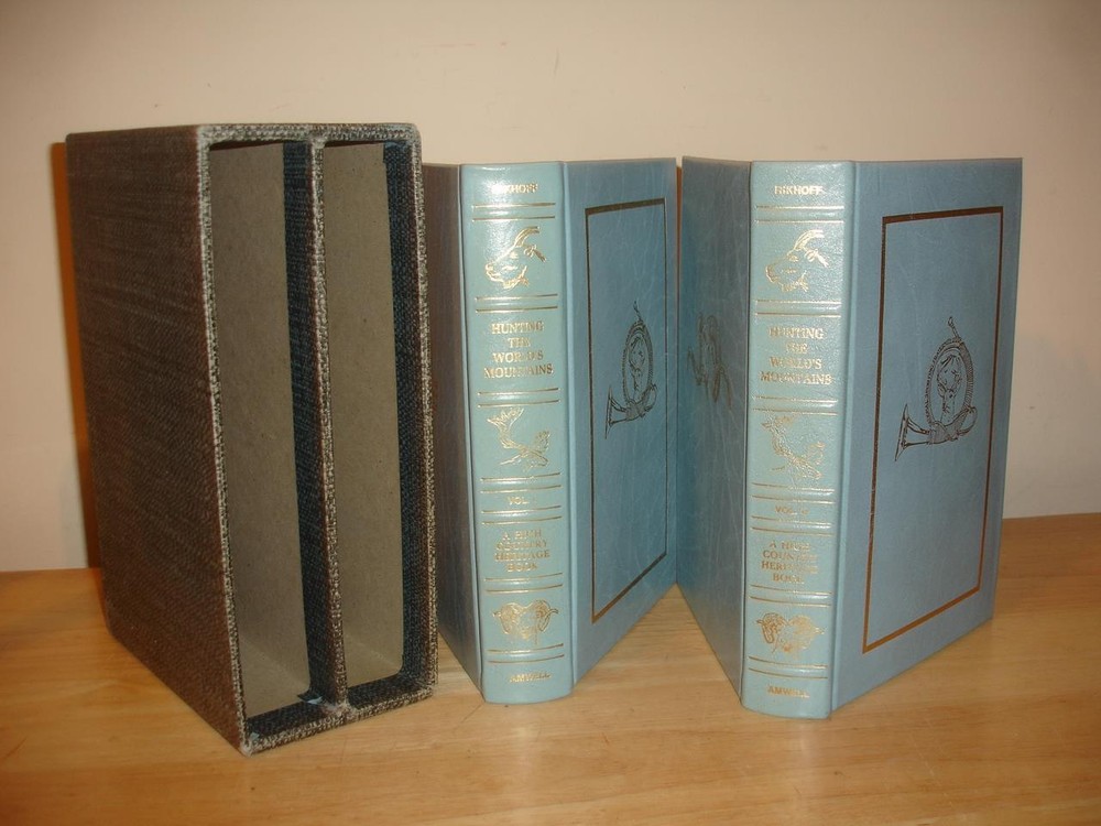 2 vol HUNTING THE WORLD'S MOUNTAINS Jim Rikoff AMWELL PRESS leather SIGNED ltd 2 vol HUNTING THE WORLD'S MOUNTAINS Jim Rikoff AMWELL PRESS leather SIGNED ltd Click images to enlarge Description This two-volume set of HUNTING THE WORLD'S MOUNTAINS by Jim Rikhoff was published by the AMWELL PRESS in 1984. This is a volume in the National Sporting Fraternity's A COUNTRY HERITAGE BOOK SERIES, and is one of there most desirable and hardest to find titles. ********************************************** The AMWELL PRESS is the publishing arm of THE NATIONAL SPORTING FRATERNITY founded in March, 1976 by Jim. Rikhoff. He was know and liked throughout the sport publishing industry as a result of his early founding of the Winchester Press. Because of his popularity with the industry he was able to get a who's who of international big game hunters and sport hunters as authors. The titles in the series would include original works by professional hunters, books by active sport hunters, anthologies that contained selections from both contemporary hunters and classic works and reprints of sought after titles. The titles are limited to 1000 copies with beautiful LEATHER bindings and SLIPCASES. These titles are all SIGNED by the author or editor or both and by Jim Rikhoff. In many editions you will find great PHOTOGRAPHS from the authors personal collections while in others you will find ILLUSTRATED from artists that capture the feel of the stories. ********************************************* HUNTING THE WORLD'S MOUNTAINS by Jim Rikhoff is a collection of stories regarding mountain hunting all over the world, by hunters such as John Jobson, Fred Bear, Russell Annabel, Theodore Roosevelt, Jack O'Connor, Warren Page, Andy Russel, among others. The book covers everything from brown bear hunting in the Himalayas to sheep hunting in Baja California, with stops off in-between in such places as New Zealand, the Andes, Alaska, Austria, Mongolia, Abyssinia, and the Scottish Highlands. ********************************************* Illustrated with an ORIGINAL color frontispiece by Peter Skirda in each volume along with NUMEROUS black and white drawings by Gordon Allen. ********************************** Beautiful light BLUE leather, spine's lettered and pictorially decorated in gilt with the picture of a ibex, elk and ram, front cover giltstamped with an stamp the "National Sporting Fraternity" and the rear cover with that of a ram, covers double-gilt-ruled, in a two-volume patterned BLUE slipcase. *******************************. THE BOOK'S AND TWO-DEPARTMENT SLIPCASE ARE IN VERY FINE CONDITION. A GREAT LOOKING SET. ********************************* LIMITED EDITION OF #230/1000 COPIES, SIGNED BY JIM RIKHOFF (THE AUTHOR AND PRESIDENT OF THE NATIONAL SPORTING FRATERNITY). ********************************* -6 1/2" by 9 1/2". -938 total pages. -foreward by John H. Batten. -introduction by Jim Rikhoff. -preface Harry Tennison, president, of the Game Conservation International. -type for this volume was set by the Westchester Book Composition, Inc., Yorktown Heights, New York. -printed on acid-free paper, and Smythe-sewn and custom bound by the Kingsport Press, Inc., Kingsport, Tennessee. -Designed by Monica Sullivan. ********************************************* HUNTING THE WORLD'S MOUNTAINS is one of the finest anthologies on mountain big-game hunting. 67 stories of hunting wild sheep, goat, bear, moose, elk, ibex, red deer, chamois, that and other game. Man has always looked toward the high places. In these pages the mountains rise, the rivers flow and the wind blows. The animals stand on alert, senses quivering to sight, sound and smell, and below man makes his slow steady progress up the mountain searching for that elusive game animal. Hopefully, this set of books will bring it all closer, in one way or another, enjoy. ********************************** During the next few months, I will be offering a number of additional AMWELL PRESS, leather, signed, slipcased, LIMITED EDITIONS, each sold seperately. I am also selling selected PREMIER PRESS, BRIAR PATCH PRESS, JOHN CULLER & SONS, AND SAFARI PRESS Limited Edition titles, as well as other leather "Hunting & Fishing" titles from other publishers. NOTE: any glare is from my camera, not the book. Images sell! Get Supersized Images & Free Image Hosting Create your brand with Auctiva's Customizable Templates. Attention Sellers - Get Templates Image Hosting, Scheduling at Auctiva.com. Track Page Views With Auctiva's Counter