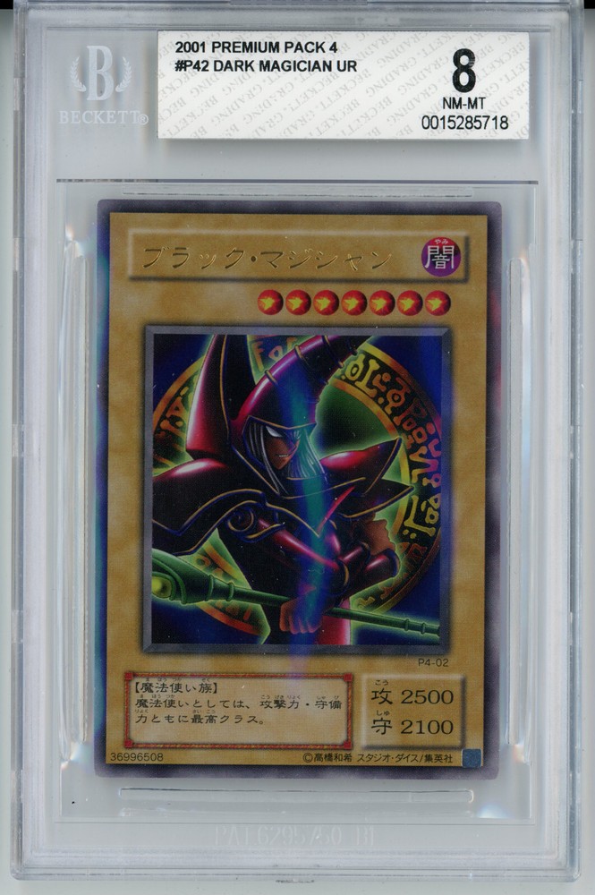 Description Condition: BGS 8 NM Availability: In Stock You are Purchasing 2001 YUGIOH JAPANESE PREMIUM PACK 4 DARK MAGICIAN #P4-02 BGS 8 NM #0015285718 Professionally graded by BECKETT GRADING SERVICES (BGS) *PLEASE REVIEW PHOTO(S) BEFORE PURCHASING >>CHECK OUT OUR OTHER POKEMON<< >>PSA CARDS ON AUCTION<< IG: CARD_RUSH_INC Payment Options Payment is expected within 2 weeks of your purchase date. We accept all forms of payments through Paypal. Shipping and Handling We ship to all U.S. states, U.S. territories, APO/FPO locations and any international countries listed under our "ship to" heading. Shipping and Handling is calculated based on the combined shipping weight of your item(s). Please use the shipping calculator to estimate your shipping and handling charges. In order to qualify for combined shipping terms, all items must be paid for in one payment; please do not pay until you are done bidding/shopping. Please contact us if you have any questions regarding our shipping and handling terms. Shipping and Delivery Packages are shipped out every Monday, Wednesday, and Friday. Domestic Packages take approximately 2-7 days to arrive. International packages may take a little longer to arrive, typically 1-4 weeks. Please allow ample transit times before inquiring about your package, thank you. Sales Tax Sales tax will be automatically collected by Ebay. Customer Service We will make every effort to get your purchase is mailed in a timely manner. Please contact us if you have any questions or concerns; we would love to hear any suggestions you have on how we can improve your eBay experience. Thank you for visiting us today.