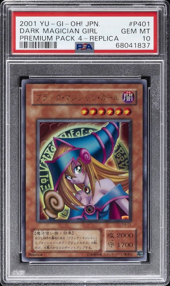 2001 YU-GI-OH! JAPANESE PREMIUM PACK 4 REPLICA #P401 DARK MAGICIAN GIRL PSA 10 2001 YU-GI-OH! JAPANESE PREMIUM PACK 4 REPLICA #P401 DARK MAGICIAN GIRL PSA 10 Purchase Info Thank you for your interest in this item consigned with PSA! By purchasing or making an offer on this item, you acknowledge and agree to the following terms: All sales are final. Returns not accepted. Payment must be made upon purchase of the item. All items are sold "as is" and without warranty of Collectors Universe, Inc. (d/b/a PSA), and ANY AND ALL IMPLIED WARRANTIES ARE DISCLAIMED AND EXCLUDED. Sales tax may apply depending on shipping address. PSA does not guarantee that another third-party grading company's authentication or certification of an item as genuine is correct or accurate. Neither a difference of opinion between third-party grading companies about authenticity, nor a company's subsequent reversal of its earlier authentication or certification of an item, will be a basis for rescinding a sale. Any dispute with another third-party grading company relating to the authenticity of an item must be resolved directly with that other company. Collectors' maximum liability in the event of loss or damage to an item during shipping will be the lesser of (a) the price paid for the item and (b) the change in fair market value of the item. You release Collectors from all other liability including for any claims of punitive damages, emotional distress, consequential damages, lost profits, or lost interest, except as prohibited by law. Shipping Purchased Items will be shipped directly from PSA Vault. You stay hands-free. PSA Vault When you purchase this item, you can save on sales tax and selling fees by keeping it in the PSA Vault, official Vault of eBay. Items already in PSA Vault and will be sent to PSA Vault will have no shipping charge Storage of any items with the PSA Vault will be subject to the PSA Vault Terms of Service. Consignment PSA has competitive rates on the world's largest collectibles marketplace with the option to list from the PSA Vault or immediately after PSA authentication and grading. Sale Price Under $100 $100 - $499 $500 - $999 $1,000 - $2,499 $2,500 - $4,999 $5,000+ Seller Fee 16% 14% 13% 10% 9% 7% Sellers pay a single fee as reflected above; no additional eBay fees are incurred. There is a $5 minimum fee on sold items.