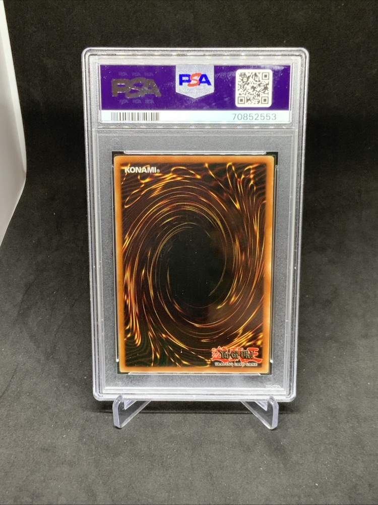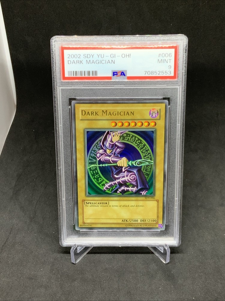 The product is a 2002 Yu-Gi-Oh! Trading Card Game Dark Magician card from the Yugi set, graded as a PSA 9. It features the attribute of Darkness and is associated with the category of Collectible Card...