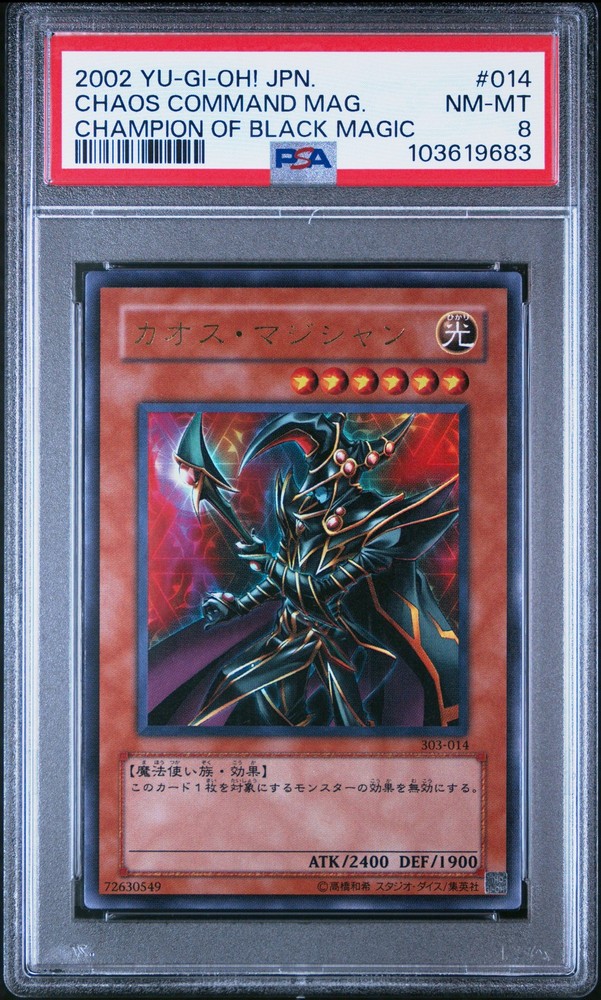 2002 YU-GI-OH! JAPANESE CHAMPION OF BLACK MAGIC #014 CHAOS COMMAND MAGICIAN PSA 8 2002 YU-GI-OH! JAPANESE CHAMPION OF BLACK MAGIC #014 CHAOS COMMAND MAGICIAN PSA 8 Purchase Info Thank you for your interest in this item consigned with PSA! By purchasing or making an offer on this item, you acknowledge and agree to the following terms: All sales are final. Returns not accepted. Payment must be made upon purchase of the item. All items are sold "as is" and without warranty of Collectors Universe, Inc. (d/b/a PSA), and ANY AND ALL IMPLIED WARRANTIES ARE DISCLAIMED AND EXCLUDED. Sales tax may apply depending on shipping address. PSA does not guarantee that another third-party grading company's authentication or certification of an item as genuine is correct or accurate. Neither a difference of opinion between third-party grading companies about authenticity, nor a company's subsequent reversal of its earlier authentication or certification of an item, will be a basis for rescinding a sale. Any dispute with another third-party grading company relating to the authenticity of an item must be resolved directly with that other company. Collectors' maximum liability in the event of loss or damage to an item during shipping will be the lesser of (a) the price paid for the item and (b) the change in fair market value of the item. You release Collectors from all other liability including for any claims of punitive damages, emotional distress, consequential damages, lost profits, or lost interest, except as prohibited by law. Shipping Purchased Items will be shipped directly from PSA Vault. You stay hands-free. PSA Vault When you purchase this item, you can save on sales tax and selling fees by keeping it in the PSA Vault, official Vault of eBay. Items already in PSA Vault and will be sent to PSA Vault will have no shipping charge Storage of any items with the PSA Vault will be subject to the PSA Vault Terms of Service. Consignment PSA has competitive rates on the world's largest collectibles marketplace with the option to list from the PSA Vault or immediately after PSA authentication and grading. Sale Price Under $100 $100 - $499 $500 - $999 $1,000 - $2,499 $2,500 - $4,999 $5,000+ Seller Fee 16% 14% 13% 10% 9% 7% Sellers pay a single fee as reflected above; no additional eBay fees are incurred. There is a $5 minimum fee on sold items.