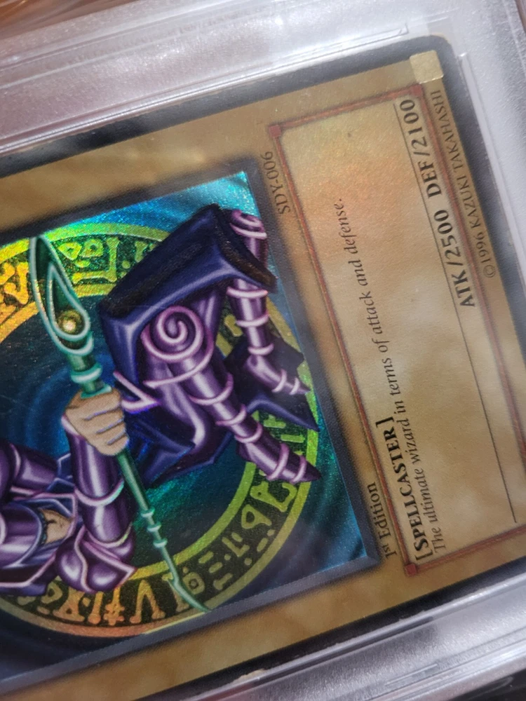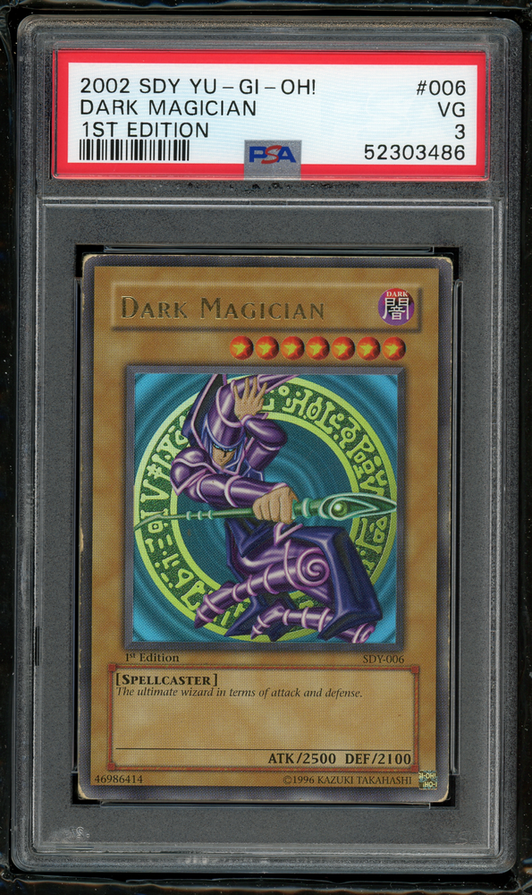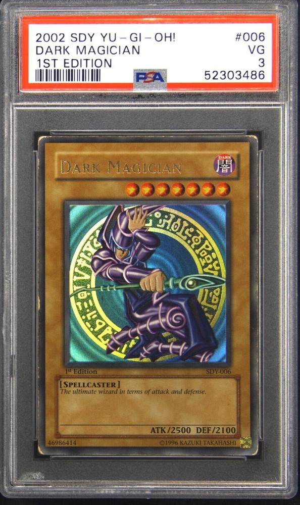 Hi, up for sale is a freshly slabbed,2002 Yu-Gi-Oh SDY-006 Dark Magician 1st Edition -Ultra Rare . The card has been professionally graded by PSA Very Good 3! This is a rare card in any grade as there are only 626 finer. This is a 25 population! and has a light full holo bleed, for those variety collectors. Perfect for any fan of the Anime, TCG, Duelist Kingdom/Battle City arc of the series, Yugi Muto, Dark Magician, Dark Magician Girl or the Spellcaster arc-type. A true trophy piece, from the Golden Era of Yu-Gi-Oh and quite possibly, one of the most sought after monsters in all of Yu-Gi-Oh!; featuring his original Anime art. Also, can fit nicely into any display case. A great way to start your PSA Yu-Gi-Oh!/Dark Magician Collection or just simply, add to it. Serious Best Offers will be entertained. However, if you do use this feature payment is due promptly. I list a 3 day handling time for the item, but usually ship the same day whenever I can. Plus, your item will be shipped in a box and fully protected. To see all of my items listed, simply go into my seller page, and filter by "newly listed or ending soonest". This card was formally in the eBay vault and it's fully authenticated by them as well, and they guarantee it 100%! Thanks again. Good luck and don't let one of the Yu-Gi-Oh holy grail cards pass you by!