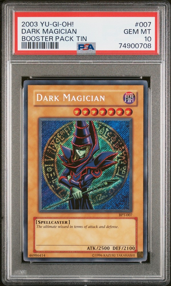 2003 YU-GI-OH! BOOSTER PACK TIN #007 DARK MAGICIAN PSA 10 2003 YU-GI-OH! BOOSTER PACK TIN #007 DARK MAGICIAN PSA 10 Purchase Info Thank you for your interest in this item consigned with PSA! By purchasing or making an offer on this item, you acknowledge and agree to the following terms: All sales are final. Returns not accepted. Payment must be made upon purchase of the item. All items are sold "as is" and without warranty of Collectors Universe, Inc. (d/b/a PSA), and ANY AND ALL IMPLIED WARRANTIES ARE DISCLAIMED AND EXCLUDED. Sales tax may apply depending on shipping address. PSA does not guarantee that another third-party grading company's authentication or certification of an item as genuine is correct or accurate. Neither a difference of opinion between third-party grading companies about authenticity, nor a company's subsequent reversal of its earlier authentication or certification of an item, will be a basis for rescinding a sale. Any dispute with another third-party grading company relating to the authenticity of an item must be resolved directly with that other company. Collectors' maximum liability in the event of loss or damage to an item during shipping will be the lesser of (a) the price paid for the item and (b) the change in fair market value of the item. You release Collectors from all other liability including for any claims of punitive damages, emotional distress, consequential damages, lost profits, or lost interest, except as prohibited by law. Shipping Purchased Items will be shipped directly from PSA Vault. You stay hands-free. PSA Vault When you purchase this item, you can save on sales tax and selling fees by keeping it in the PSA Vault, official Vault of eBay. Items already in PSA Vault and will be sent to PSA Vault will have no shipping charge Storage of any items with the PSA Vault will be subject to the PSA Vault Terms of Service. Consignment PSA has competitive rates on the world's largest collectibles marketplace with the option to list from the PSA Vault or immediately after PSA authentication and grading. Sale Price Under $100 $100 - $499 $500 - $999 $1,000 - $2,499 $2,500 - $4,999 $5,000+ Seller Fee 16% 14% 13% 10% 9% 7% Sellers pay a single fee as reflected above; no additional eBay fees are incurred. There is a $5 minimum fee on sold items.