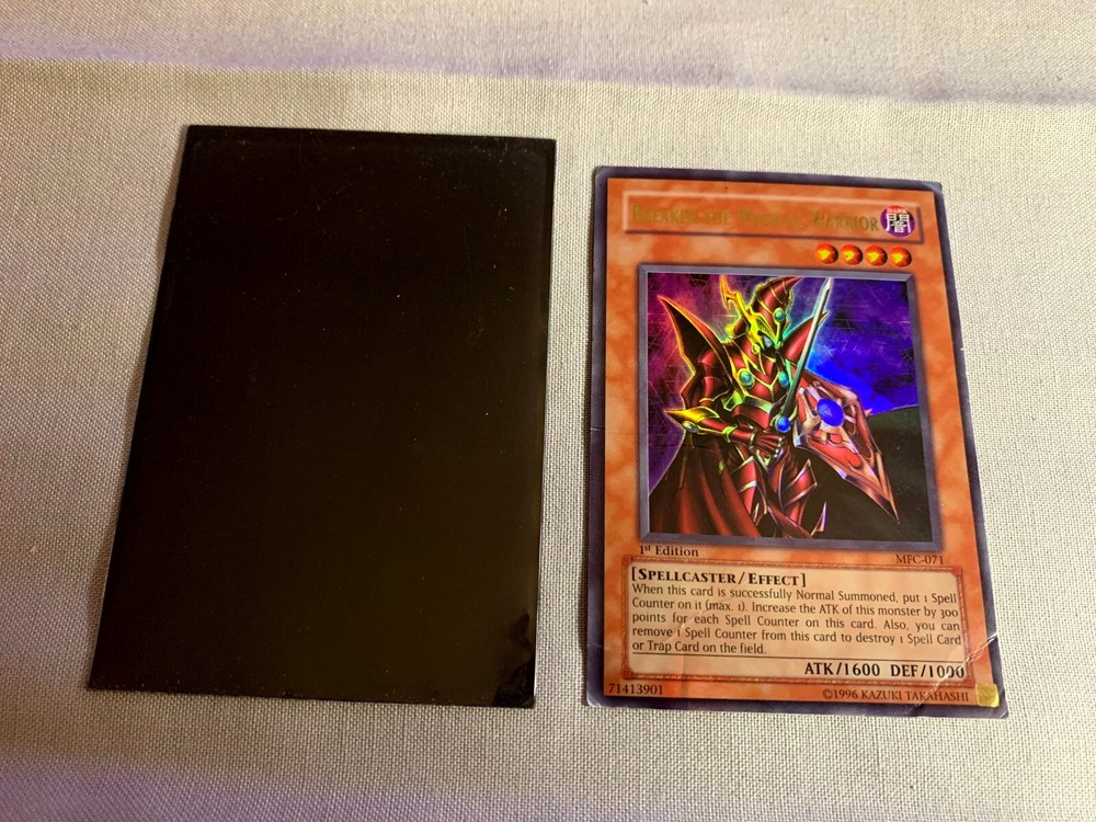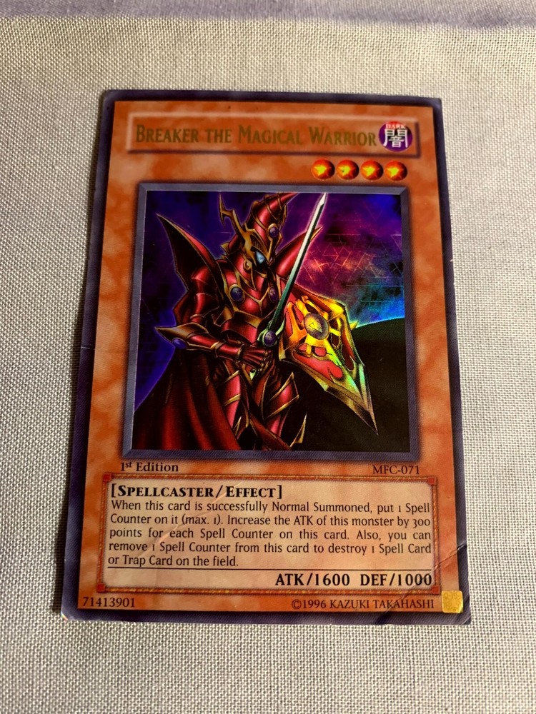 The product is a 2003 Yu-Gi-Oh! TCG card from the "Magician's Force" set. It features Breaker the Magical Warrior, a Magic Warrior type creature/monster. The card is a 1st Edition and has been graded ...