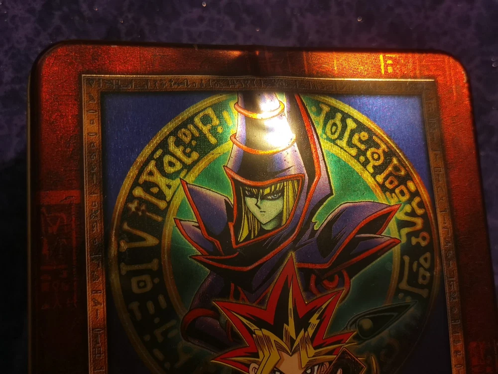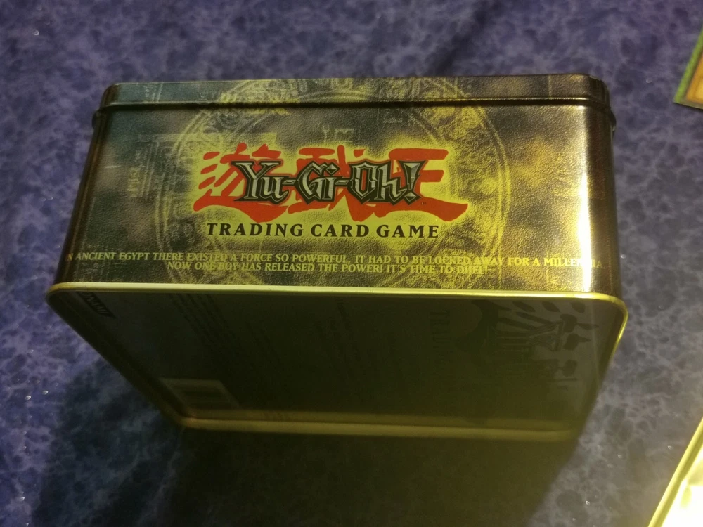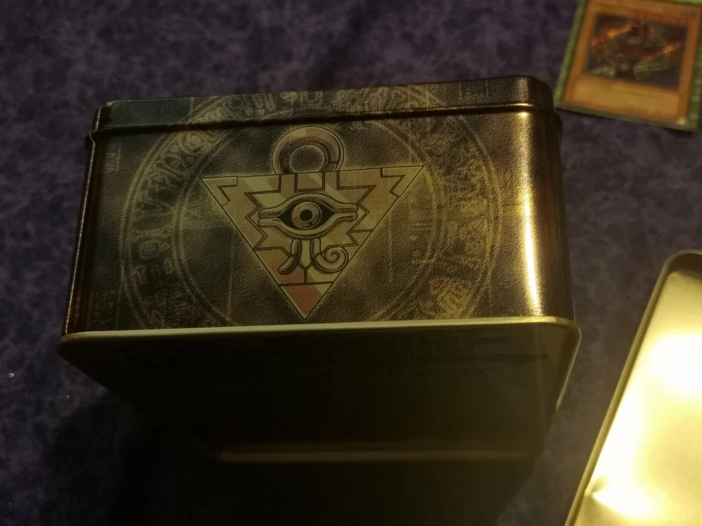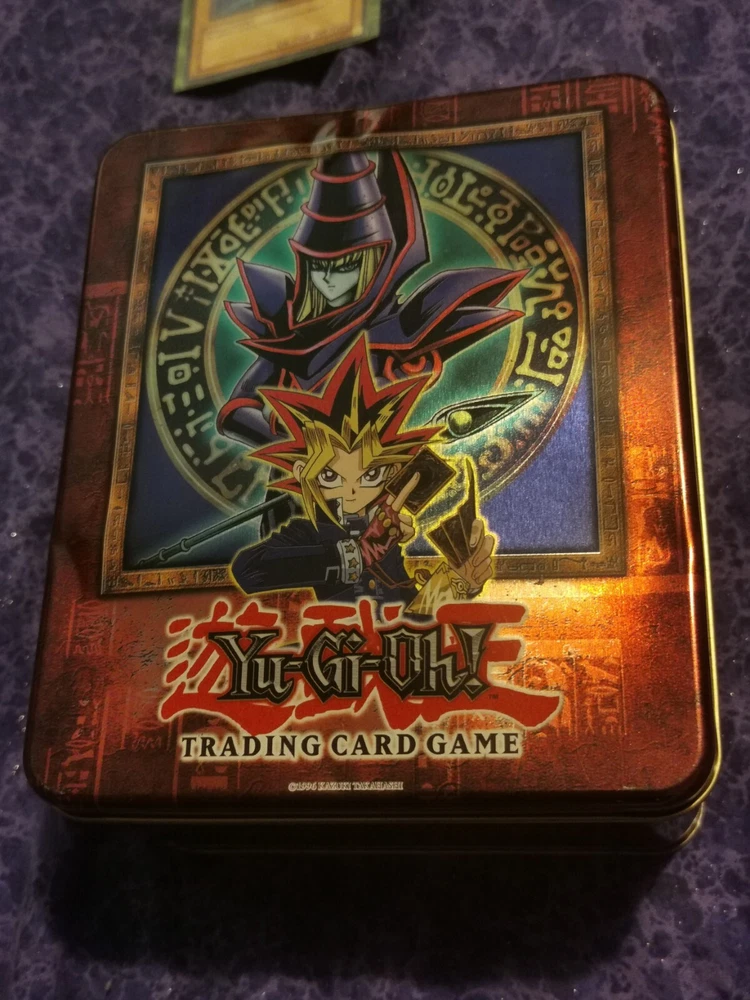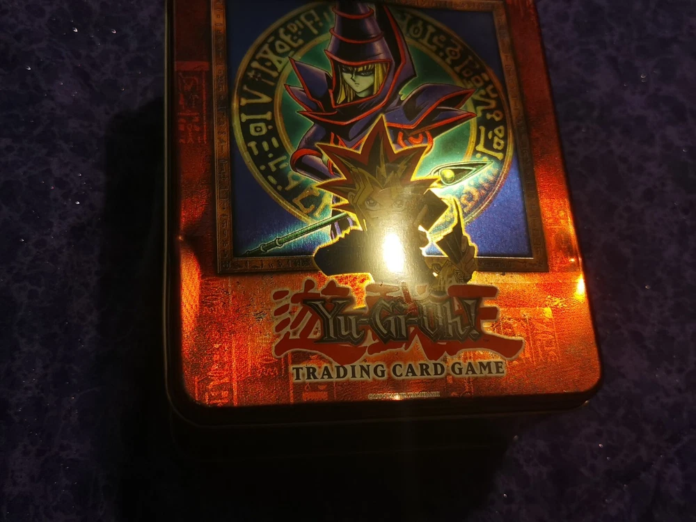2003 Yu-Gi-Oh Tin empty with Dark Magician promo. The back of Dark Magician has scratches and there is a crease toward the lower right of the front. The tin is imperfect, but I hope you enjoy both the tin and card and proudly add them to your collection! If you need additional pictures or have any questions at all, please just ask!