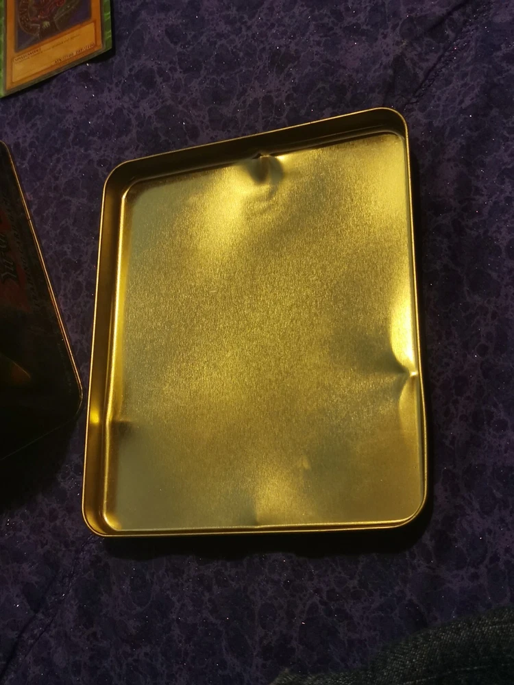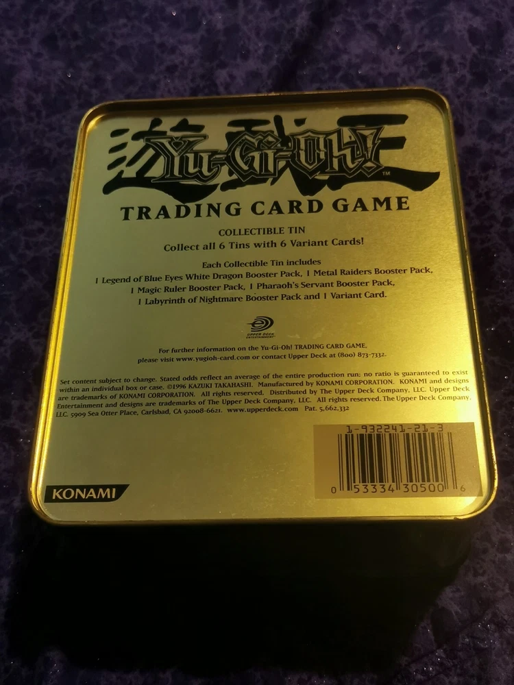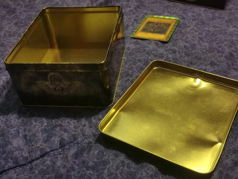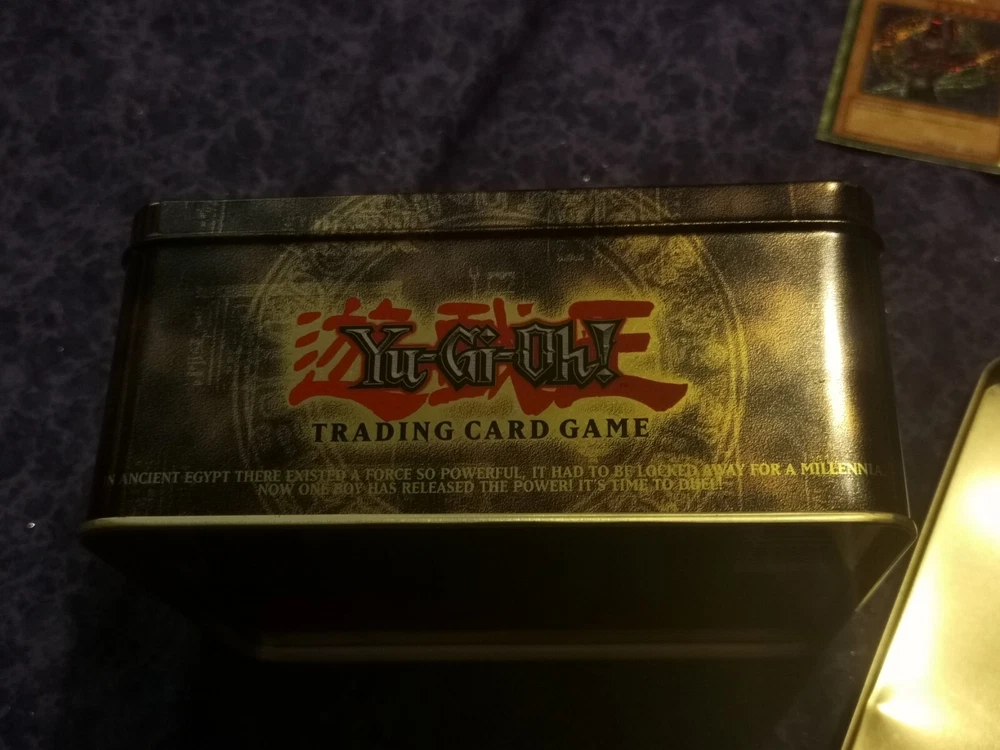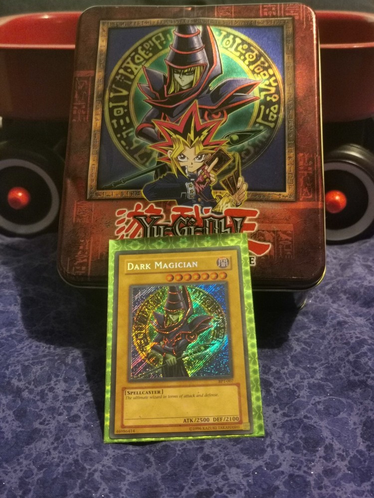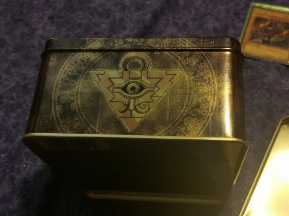 2003 Yu-Gi-Oh Tin empty with Dark Magician promo. The back of Dark Magician has scratches and there is a crease toward the lower right of the front. The tin is imperfect, but I hope you enjoy both the tin and card and proudly add them to your collection! If you need additional pictures or have any questions at all, please just ask!