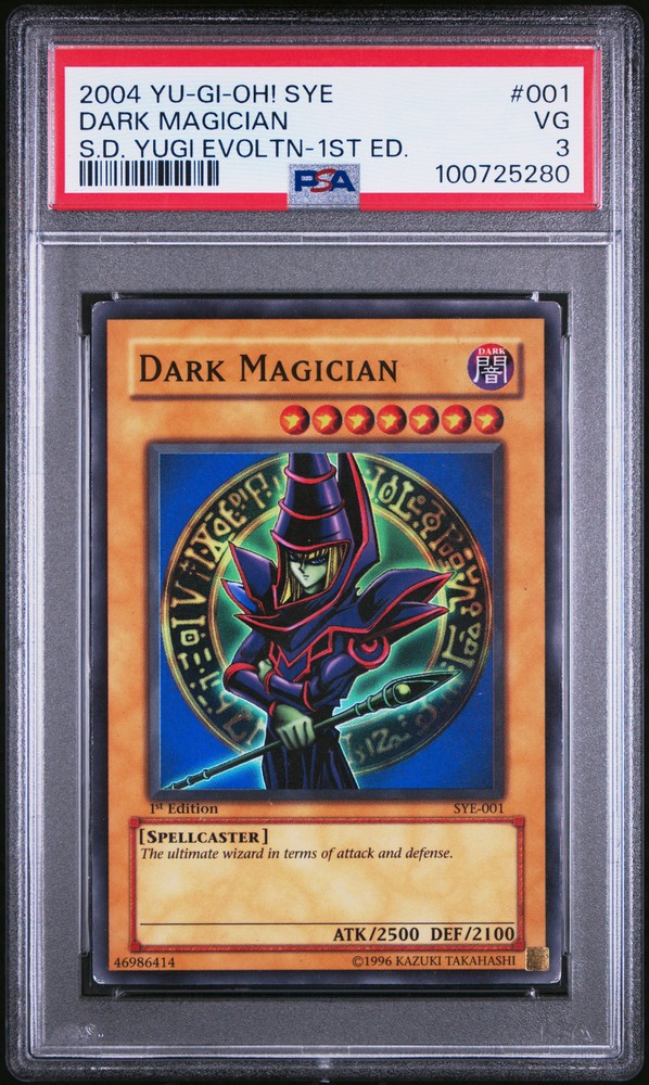 2004 SYE YU-GI-OH! STARTER DECK YUGI EVOLUTION 1ST EDITION #001 DARK MAGICIAN PSA 3 2004 SYE YU-GI-OH! STARTER DECK YUGI EVOLUTION 1ST EDITION #001 DARK MAGICIAN PSA 3 Purchase Info Thank you for your interest in this item consigned with PSA! By purchasing or making an offer on this item, you acknowledge and agree to the following terms: All sales are final. Returns not accepted. Payment must be made upon purchase of the item. All items are sold "as is" and without warranty of Collectors Universe, Inc. (d/b/a PSA), and ANY AND ALL IMPLIED WARRANTIES ARE DISCLAIMED AND EXCLUDED. Sales tax may apply depending on shipping address. PSA does not guarantee that another third-party grading company's authentication or certification of an item as genuine is correct or accurate. Neither a difference of opinion between third-party grading companies about authenticity, nor a company's subsequent reversal of its earlier authentication or certification of an item, will be a basis for rescinding a sale. Any dispute with another third-party grading company relating to the authenticity of an item must be resolved directly with that other company. Collectors' maximum liability in the event of loss or damage to an item during shipping will be the lesser of (a) the price paid for the item and (b) the change in fair market value of the item. You release Collectors from all other liability including for any claims of punitive damages, emotional distress, consequential damages, lost profits, or lost interest, except as prohibited by law. Shipping Purchased Items will be shipped directly from PSA Vault. You stay hands-free. PSA Vault When you purchase this item, you can save on sales tax and selling fees by keeping it in the PSA Vault, official Vault of eBay. Items already in PSA Vault and will be sent to PSA Vault will have no shipping charge Storage of any items with the PSA Vault will be subject to the PSA Vault Terms of Service. Consignment PSA has competitive rates on the world's largest collectibles marketplace with the option to list from the PSA Vault or immediately after PSA authentication and grading. Sale Price Under $100 $100 - $499 $500 - $999 $1,000 - $2,499 $2,500 - $4,999 $5,000+ Seller Fee 16% 14% 13% 10% 9% 7% Sellers pay a single fee as reflected above; no additional eBay fees are incurred. There is a $5 minimum fee on sold items.