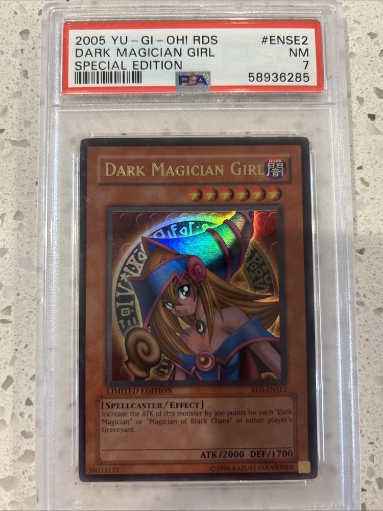 This is a 2005 Yu-Gi-Oh! TCG Dark Magician Girl card from the Special Edition RDS Promo set. It is an ultra rare, English language card with a foil finish. The card is a limited edition promo featuring the monster Dark Magician Girl, with the card number RDS-ENSE2. It was manufactured by Konami as part of a special edition release.