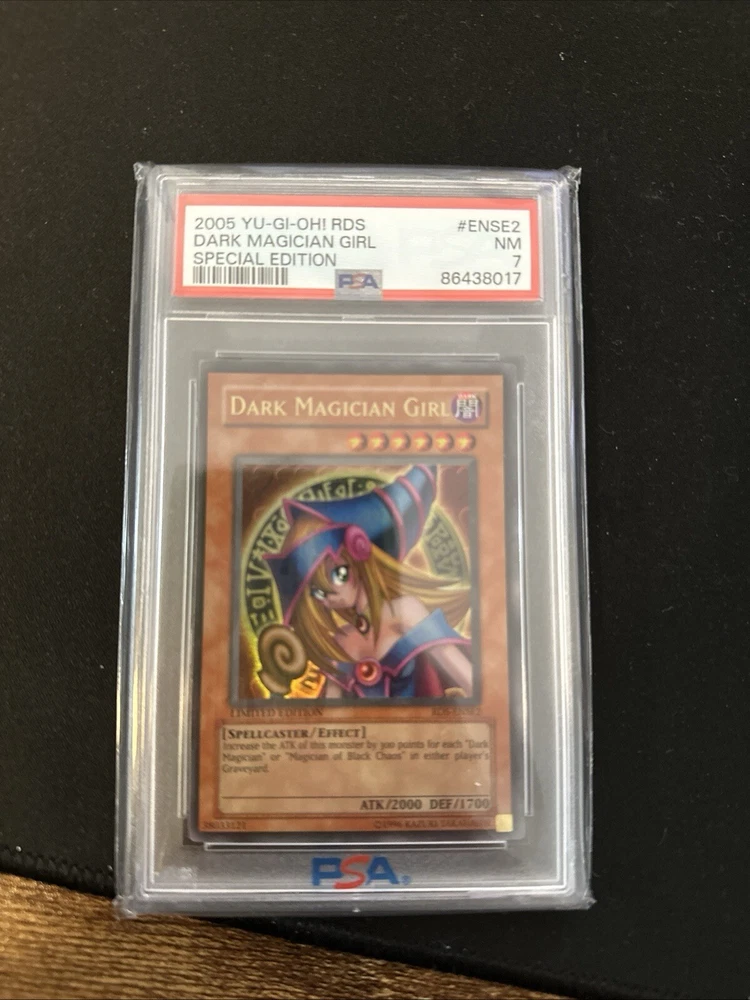 Dive into the world of Yu-Gi-Oh! with the highly sought-after Dark Magician Girl card from the Rise of Destiny set. This Ultra Rare card, numbered ENSE2, features the enigmatic Dark Magician Girl, a must-have for collectors and players alike. Its limited edition status and promo features make it a standout piece, while the holographic finish adds a shimmering allure to the spellcaster's enchanting presence. Crafted by Konami in 2005 and manufactured in the United States, this English-language card is a true vintage gem. The card's attribute is set in the 'Dark' color realm, and it's classified as an 'Effect' type card within the Yu-Gi-Oh! TCG. With its PSA 7 NEAR MINT grading, it's a remarkable find for those who appreciate the nostalgia and power of the Yu-Gi-Oh! trading card game.