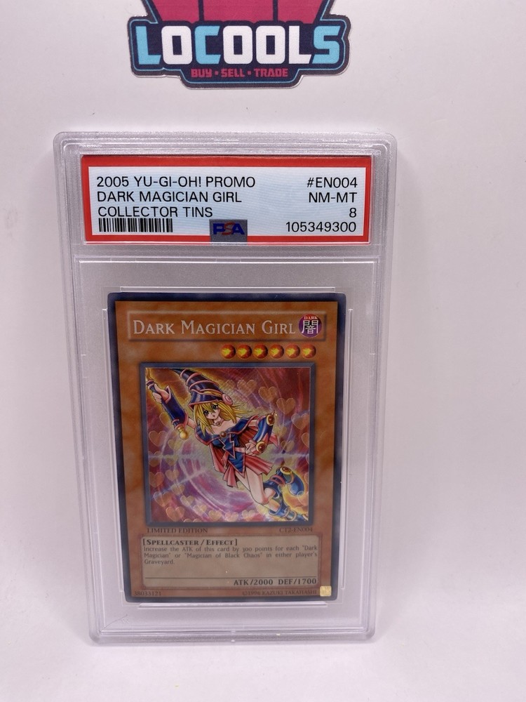 The product is a 2005 Yugioh Collector Tins Promo Dark Magician Girl CT2-EN004 limited edition card graded as PSA 8. This collectible card features the character Dark Magician Girl from the Yu-Gi-Oh! TCG set. Manufactured by Konami, the card is a Secret Rare with a Holo finish, making it a sought-after item for collectors of CCG individual cards. With its dark attribute and spellcaster creature type, this limited edition card is a valuable addition to any Yugioh collection.