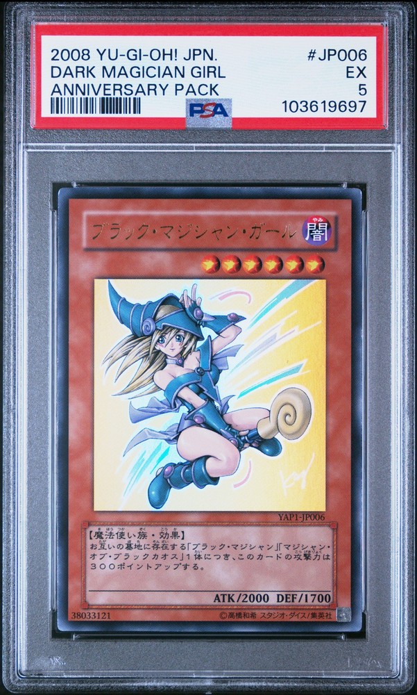 2008 YU-GI-OH! JAPANESE YAP1-ANNIVERSARY PACK #JP006 DARK MAGICIAN GIRL PSA 5 2008 YU-GI-OH! JAPANESE YAP1-ANNIVERSARY PACK #JP006 DARK MAGICIAN GIRL PSA 5 Purchase Info Thank you for your interest in this item consigned with PSA! By purchasing or making an offer on this item, you acknowledge and agree to the following terms: All sales are final. Returns not accepted. Payment must be made upon purchase of the item. All items are sold "as is" and without warranty of Collectors Universe, Inc. (d/b/a PSA), and ANY AND ALL IMPLIED WARRANTIES ARE DISCLAIMED AND EXCLUDED. Sales tax may apply depending on shipping address. PSA does not guarantee that another third-party grading company's authentication or certification of an item as genuine is correct or accurate. Neither a difference of opinion between third-party grading companies about authenticity, nor a company's subsequent reversal of its earlier authentication or certification of an item, will be a basis for rescinding a sale. Any dispute with another third-party grading company relating to the authenticity of an item must be resolved directly with that other company. Collectors' maximum liability in the event of loss or damage to an item during shipping will be the lesser of (a) the price paid for the item and (b) the change in fair market value of the item. You release Collectors from all other liability including for any claims of punitive damages, emotional distress, consequential damages, lost profits, or lost interest, except as prohibited by law. Shipping Purchased Items will be shipped directly from PSA Vault. You stay hands-free. PSA Vault When you purchase this item, you can save on sales tax and selling fees by keeping it in the PSA Vault, official Vault of eBay. Items already in PSA Vault and will be sent to PSA Vault will have no shipping charge Storage of any items with the PSA Vault will be subject to the PSA Vault Terms of Service. Consignment PSA has competitive rates on the world's largest collectibles marketplace with the option to list from the PSA Vault or immediately after PSA authentication and grading. Sale Price Under $100 $100 - $499 $500 - $999 $1,000 - $2,499 $2,500 - $4,999 $5,000+ Seller Fee 16% 14% 13% 10% 9% 7% Sellers pay a single fee as reflected above; no additional eBay fees are incurred. There is a $5 minimum fee on sold items.