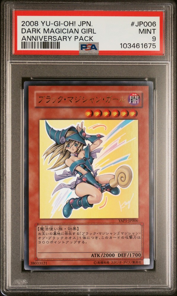 2008 YU-GI-OH! JAPANESE YAP1-ANNIVERSARY PACK #JP006 DARK MAGICIAN GIRL PSA 9 2008 YU-GI-OH! JAPANESE YAP1-ANNIVERSARY PACK #JP006 DARK MAGICIAN GIRL PSA 9 Purchase Info Thank you for your interest in this item consigned with PSA! By purchasing or making an offer on this item, you acknowledge and agree to the following terms: All sales are final. Returns not accepted. Payment must be made upon purchase of the item. All items are sold "as is" and without warranty of Collectors Universe, Inc. (d/b/a PSA), and ANY AND ALL IMPLIED WARRANTIES ARE DISCLAIMED AND EXCLUDED. Sales tax may apply depending on shipping address. PSA does not guarantee that another third-party grading company's authentication or certification of an item as genuine is correct or accurate. Neither a difference of opinion between third-party grading companies about authenticity, nor a company's subsequent reversal of its earlier authentication or certification of an item, will be a basis for rescinding a sale. Any dispute with another third-party grading company relating to the authenticity of an item must be resolved directly with that other company. Collectors' maximum liability in the event of loss or damage to an item during shipping will be the lesser of (a) the price paid for the item and (b) the change in fair market value of the item. You release Collectors from all other liability including for any claims of punitive damages, emotional distress, consequential damages, lost profits, or lost interest, except as prohibited by law. Shipping Purchased Items will be shipped directly from PSA Vault. You stay hands-free. PSA Vault When you purchase this item, you can save on sales tax and selling fees by keeping it in the PSA Vault, official Vault of eBay. Items already in PSA Vault and will be sent to PSA Vault will have no shipping charge Storage of any items with the PSA Vault will be subject to the PSA Vault Terms of Service. Consignment PSA has competitive rates on the world's largest collectibles marketplace with the option to list from the PSA Vault or immediately after PSA authentication and grading. Sale Price Under $100 $100 - $499 $500 - $999 $1,000 - $2,499 $2,500 - $4,999 $5,000+ Seller Fee 16% 14% 13% 10% 9% 7% Sellers pay a single fee as reflected above; no additional eBay fees are incurred. There is a $5 minimum fee on sold items.