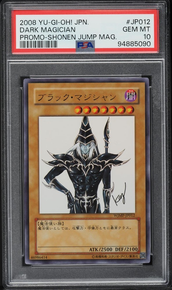 Step into the world of high-magic fantasy with the iconic Dark Magician card from the Yu-Gi-Oh! Trading Card Game. This 2008 Japanese Promo Shonen Jump exclusive, card number WJMP-JP012, has been meticulously preserved and achieved the prestigious PSA 10 GEM rating, confirming its pristine quality. Collectors and duelists alike will appreciate the rarity and significance of this card. Not only is it a piece of Yu-Gi-Oh! history, but it also showcases the artistry that has captivated fans for years. Add this gem to your collection and own a piece of the game's storied legacy.