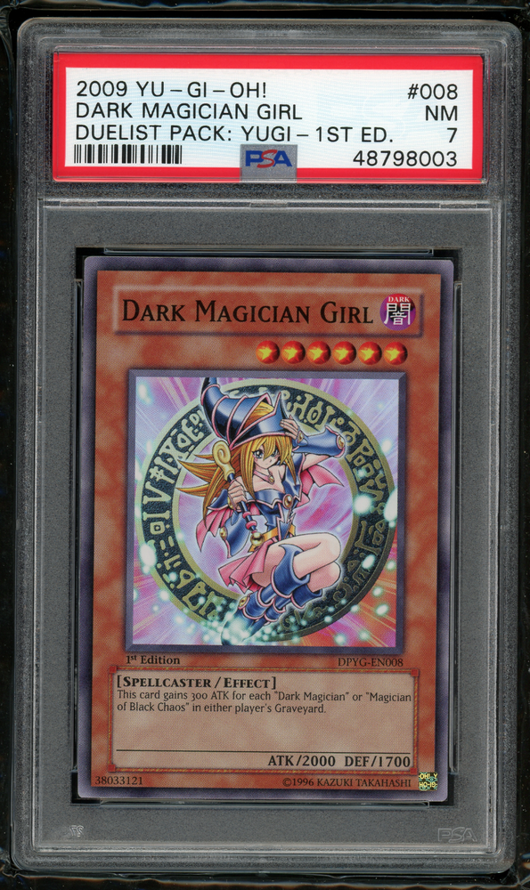 Hi, up for sale is a freshly slabbed, 2009 YU-GI-OH! DUELIST PACK: YUGI EN008 DARK MAGICIAN GIRL 1ST EDITION -Super Rare . The card has been professionally graded by PSA Near Mint 7! This is a rare card in any grade as there are only 91 finer. This is a 1/21 population! Perfect for any fan of the Anime, TCG, Duelist Kingdom/Battle City arc of the series, Yugi Muto, Dark Magician/Girl or the Yu-Gi-Oh Spellcasters. A true trophy piece, from the Golden Era of Yu-Gi-Oh and quite possibly, one of the, if not the most sought after monster(s) in all of Yu-Gi-Oh! Also, can fit nicely into any display case. A great way to start your PSA Yu-Gi-Oh!/Dark Magician Girl Collection or just simply, add to it. Serious Best Offers will be entertained. However, if you do use this feature payment is due promptly. I list a 3 day handling time for the item, but usually ship the same day whenever I can. Plus, Your item will be shipped in a box and fully protected. To see all of my items listed, simply go into my seller page, and filter by "newly listed or ending soonest". Thanks again. Good luck and don't let this one pass you by!
