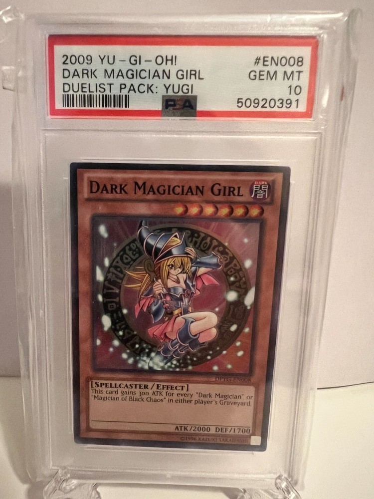 Product Features and Description Item: 2009 Yu-Gi-Oh! Dark Magician Girl #EN008 GEM PSA 10 Duelist Pack: YUGI Shipping, Handling and Delivery U.S. Residents' shipping details and options: USPS Standard Shipping: FREE Additional shipping features: Delivery Confirmation No Pickups, absolutely no exceptions will be made All packages are shipped on within 2-3 business days after payment. We ship only to PayPal provided addresses. Payment Options Via PayPal (Payments must be cleared before any shipments are made) Returns & Exchange Policy Returns are accepted within 14 days of delivery There will be a 15% restocking fee for returns Item must be in the same condition it was shipped in Buyer will pay for shipping and a restocking fee Our Policies Items for sale are described as accurately and to the best of our knowledge and according to the Manufacturer's details on the packaging labels. Please read the entire description of any items you intend to purchase or contact us if you have any questions and concerns.