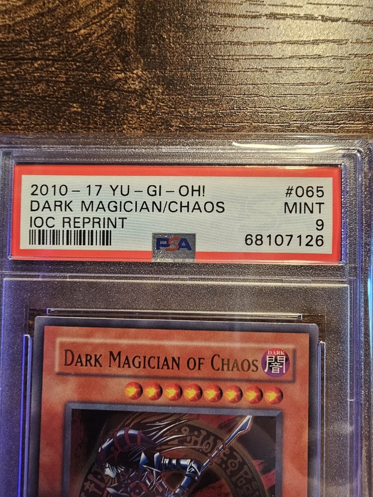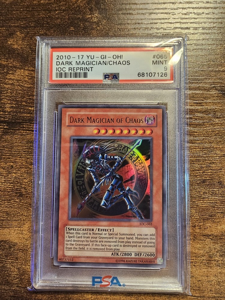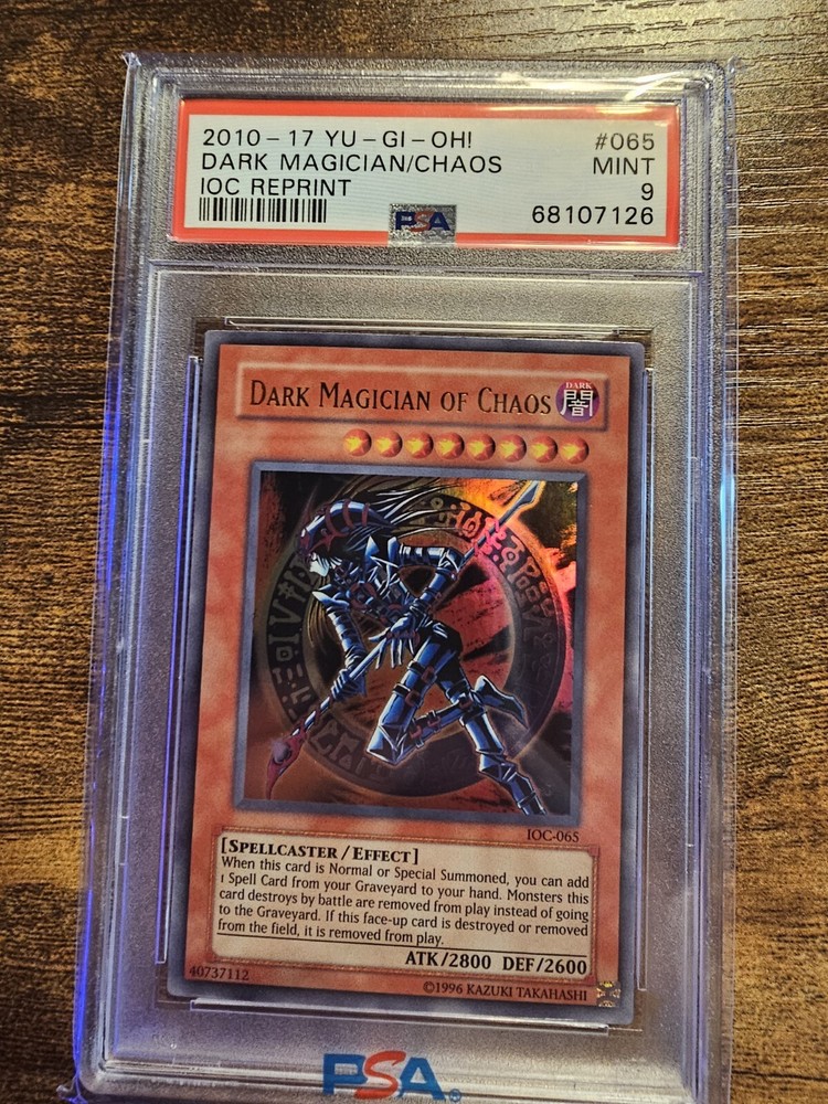 This is a PSA grade 9 Dark Magician of Chaos IOC reprint 2010-2017. The back of the slab does have a crack in it so please see all pictures for details before buying! Message me with any questions and I'll get back as soon as possible!