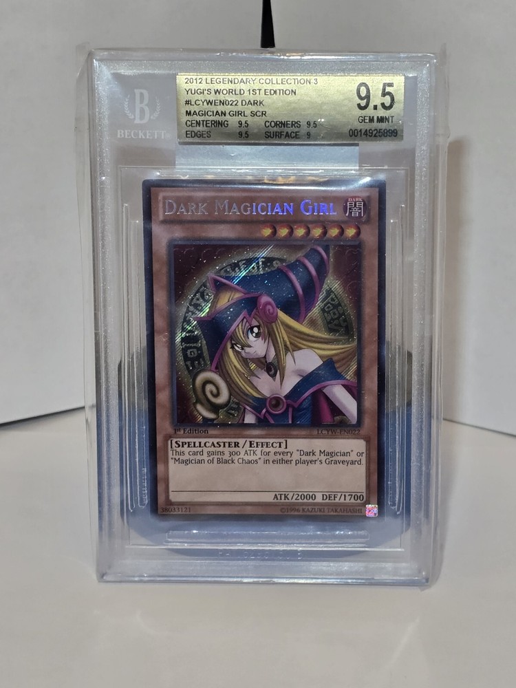 This is a 1st edition LCYW Dark Magician Girl graded by Beckett in a Gem Mint 9.5. I added another sleeve to cover the original sleeve that Ebay used to add the authentication sticker since the sleeve was slowly tearing on one of the edges. Lowest price for a GEM MT card that can possibly crossover to PSA for a GEM MT 10, so buy it now! This card is a must-have for any collector! Population 8 graded in a 9.5!! I am open to offers, so please reach out if you have any questions!!