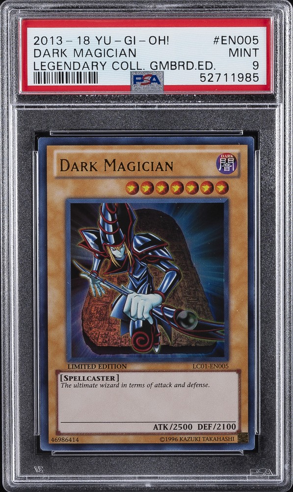 2013-2018 YU-GI-OH! LEGENDARY COLLECTION GAMEBOARD EDITION #EN005 DARK MAGICIAN PSA 9 2013-2018 YU-GI-OH! LEGENDARY COLLECTION GAMEBOARD EDITION #EN005 DARK MAGICIAN PSA 9 Purchase Info Thank you for your interest in this item consigned with PSA! By purchasing or making an offer on this item, you acknowledge and agree to the following terms: All sales are final. Returns not accepted. Payment must be made upon purchase of the item. All items are sold "as is" and without warranty of Collectors Universe, Inc. (d/b/a PSA), and ANY AND ALL IMPLIED WARRANTIES ARE DISCLAIMED AND EXCLUDED. Sales tax may apply depending on shipping address. PSA does not guarantee that another third-party grading company's authentication or certification of an item as genuine is correct or accurate. Neither a difference of opinion between third-party grading companies about authenticity, nor a company's subsequent reversal of its earlier authentication or certification of an item, will be a basis for rescinding a sale. Any dispute with another third-party grading company relating to the authenticity of an item must be resolved directly with that other company. Collectors' maximum liability in the event of loss or damage to an item during shipping will be the lesser of (a) the price paid for the item and (b) the change in fair market value of the item. You release Collectors from all other liability including for any claims of punitive damages, emotional distress, consequential damages, lost profits, or lost interest, except as prohibited by law. Shipping Purchased Items will be shipped directly from PSA Vault. You stay hands-free. PSA Vault When you purchase this item, you can save on sales tax and selling fees by keeping it in the PSA Vault, official Vault of eBay. Items already in PSA Vault and will be sent to PSA Vault will have no shipping charge Storage of any items with the PSA Vault will be subject to the PSA Vault Terms of Service. Consignment PSA has competitive rates on the world's largest collectibles marketplace with the option to list from the PSA Vault or immediately after PSA authentication and grading. Sale Price Under $100 $100 - $499 $500 - $999 $1,000 - $2,499 $2,500 - $4,999 $5,000+ Seller Fee 16% 14% 13% 10% 9% 7% Sellers pay a single fee as reflected above; no additional eBay fees are incurred. There is a $5 minimum fee on sold items.