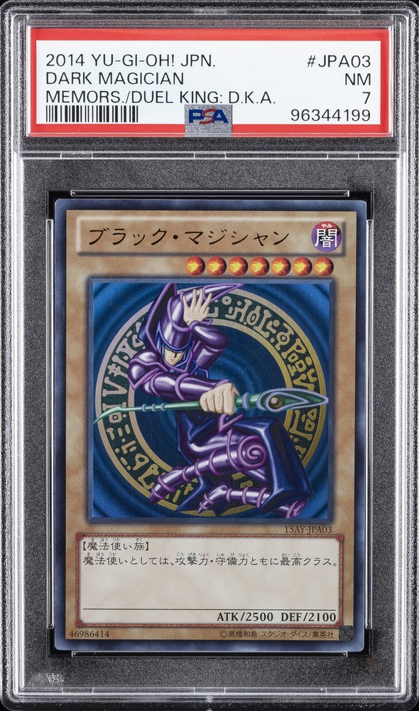 2014 YU-GI-OH! JAPANESE 15AY-MEMORIES OF THE DUEL KING: DUELIST KINGDOM ARC #JPA03 DARK MAGICIAN PSA 7 2014 YU-GI-OH! JAPANESE 15AY-MEMORIES OF THE DUEL KING: DUELIST KINGDOM ARC #JPA03 DARK MAGICIAN PSA 7 Purchase Info Thank you for your interest in this item consigned with PSA! By purchasing or making an offer on this item, you acknowledge and agree to the following terms: All sales are final. Returns not accepted. Payment must be made upon purchase of the item. All items are sold "as is" and without warranty of Collectors Universe, Inc. (d/b/a PSA), and ANY AND ALL IMPLIED WARRANTIES ARE DISCLAIMED AND EXCLUDED. Sales tax may apply depending on shipping address. PSA does not guarantee that another third-party grading company's authentication or certification of an item as genuine is correct or accurate. Neither a difference of opinion between third-party grading companies about authenticity, nor a company's subsequent reversal of its earlier authentication or certification of an item, will be a basis for rescinding a sale. Any dispute with another third-party grading company relating to the authenticity of an item must be resolved directly with that other company. Collectors' maximum liability in the event of loss or damage to an item during shipping will be the lesser of (a) the price paid for the item and (b) the change in fair market value of the item. You release Collectors from all other liability including for any claims of punitive damages, emotional distress, consequential damages, lost profits, or lost interest, except as prohibited by law. Shipping Purchased Items will be shipped directly from PSA Vault. You stay hands-free. PSA Vault When you purchase this item, you can save on sales tax and selling fees by keeping it in the PSA Vault, official Vault of eBay. Items already in PSA Vault and will be sent to PSA Vault will have no shipping charge Storage of any items with the PSA Vault will be subject to the PSA Vault Terms of Service. Consignment PSA has competitive rates on the world's largest collectibles marketplace with the option to list from the PSA Vault or immediately after PSA authentication and grading. Sale Price Under $100 $100 - $499 $500 - $999 $1,000 - $2,499 $2,500 - $4,999 $5,000+ Seller Fee 16% 14% 13% 10% 9% 7% Sellers pay a single fee as reflected above; no additional eBay fees are incurred. There is a $5 minimum fee on sold items.