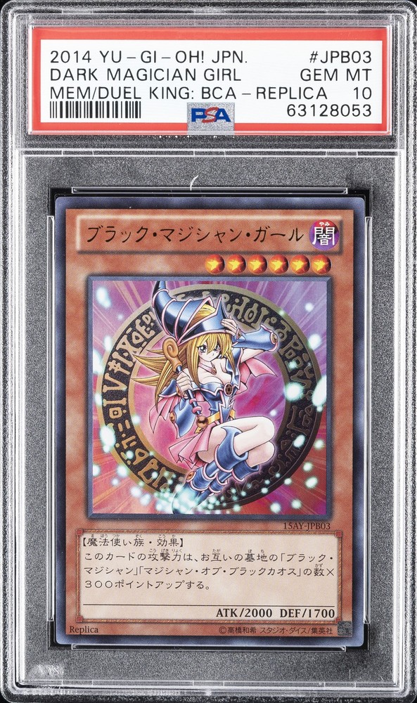 2014 YU-GI-OH! JAPANESE MEMORIES OF THE DUEL KING: BATTLE CITY ARC REPLICA #JPB03 DARK MAGICIAN GIRL PSA 10 2014 YU-GI-OH! JAPANESE MEMORIES OF THE DUEL KING: BATTLE CITY ARC REPLICA #JPB03 DARK MAGICIAN GIRL PSA 10 Purchase Info Thank you for your interest in this item consigned with PSA! By purchasing or making an offer on this item, you acknowledge and agree to the following terms: All sales are final. Returns not accepted. Payment must be made upon purchase of the item. All items are sold "as is" and without warranty of Collectors Universe, Inc. (d/b/a PSA), and ANY AND ALL IMPLIED WARRANTIES ARE DISCLAIMED AND EXCLUDED. Sales tax may apply depending on shipping address. PSA does not guarantee that another third-party grading company's authentication or certification of an item as genuine is correct or accurate. Neither a difference of opinion between third-party grading companies about authenticity, nor a company's subsequent reversal of its earlier authentication or certification of an item, will be a basis for rescinding a sale. Any dispute with another third-party grading company relating to the authenticity of an item must be resolved directly with that other company. Collectors' maximum liability in the event of loss or damage to an item during shipping will be the lesser of (a) the price paid for the item and (b) the change in fair market value of the item. You release Collectors from all other liability including for any claims of punitive damages, emotional distress, consequential damages, lost profits, or lost interest, except as prohibited by law. Shipping Purchased Items will be shipped directly from PSA Vault. You stay hands-free. PSA Vault When you purchase this item, you can save on sales tax and selling fees by keeping it in the PSA Vault, official Vault of eBay. Items already in PSA Vault and will be sent to PSA Vault will have no shipping charge Storage of any items with the PSA Vault will be subject to the PSA Vault Terms of Service. Consignment PSA has competitive rates on the world's largest collectibles marketplace with the option to list from the PSA Vault or immediately after PSA authentication and grading. Sale Price Under $100 $100 - $499 $500 - $999 $1,000 - $2,499 $2,500 - $4,999 $5,000+ Seller Fee 16% 14% 13% 10% 9% 7% Sellers pay a single fee as reflected above; no additional eBay fees are incurred. There is a $5 minimum fee on sold items.