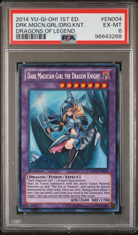 2014 YU-GI-OH! DRAGONS OF LEGEND 1ST EDITION #EN004 DARK MAGICIAN GIRL THE DRAGON KNIGHT PSA 6 2014 YU-GI-OH! DRAGONS OF LEGEND 1ST EDITION #EN004 DARK MAGICIAN GIRL THE DRAGON KNIGHT PSA 6 Purchase Info Thank you for your interest in this item consigned with PSA! By purchasing or making an offer on this item, you acknowledge and agree to the following terms: All sales are final. Returns not accepted. Payment must be made upon purchase of the item. All items are sold "as is" and without warranty of Collectors Universe, Inc. (d/b/a PSA), and ANY AND ALL IMPLIED WARRANTIES ARE DISCLAIMED AND EXCLUDED. Sales tax may apply depending on shipping address. PSA does not guarantee that another third-party grading company's authentication or certification of an item as genuine is correct or accurate. Neither a difference of opinion between third-party grading companies about authenticity, nor a company's subsequent reversal of its earlier authentication or certification of an item, will be a basis for rescinding a sale. Any dispute with another third-party grading company relating to the authenticity of an item must be resolved directly with that other company. Collectors' maximum liability in the event of loss or damage to an item during shipping will be the lesser of (a) the price paid for the item and (b) the change in fair market value of the item. You release Collectors from all other liability including for any claims of punitive damages, emotional distress, consequential damages, lost profits, or lost interest, except as prohibited by law. Shipping Purchased Items will be shipped directly from PSA Vault. You stay hands-free. PSA Vault When you purchase this item, you can save on sales tax and selling fees by keeping it in the PSA Vault, official Vault of eBay. Items already in PSA Vault and will be sent to PSA Vault will have no shipping charge Storage of any items with the PSA Vault will be subject to the PSA Vault Terms of Service. Consignment PSA has competitive rates on the world's largest collectibles marketplace with the option to list from the PSA Vault or immediately after PSA authentication and grading. Sale Price Under $100 $100 - $499 $500 - $999 $1,000 - $2,499 $2,500 - $4,999 $5,000+ Seller Fee 16% 14% 13% 10% 9% 7% Sellers pay a single fee as reflected above; no additional eBay fees are incurred. There is a $5 minimum fee on sold items.