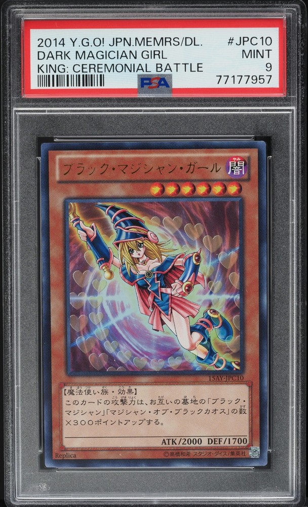 This 2014 YU-GI-OH! JAPANESE MEMORIES DUEL KING DARK MAGICIAN GIRL #15AY-JPC10 PSA 9 is a must-have for any collector of rare cards. With its stunning Secret Rare rarity and Japanese language, this card is perfect for fans of the Yu-Gi-Oh! TCG. Featuring the iconic Dark Magician Girl as a Spellcaster Monster and card size of Japanese, this card is suitable for fans of all ages and levels. The card has not been autographed and is part of the - Yugi - set manufactured by Konami. It is a great addition to any CCG Individual Cards or Collectible Card Games collection.