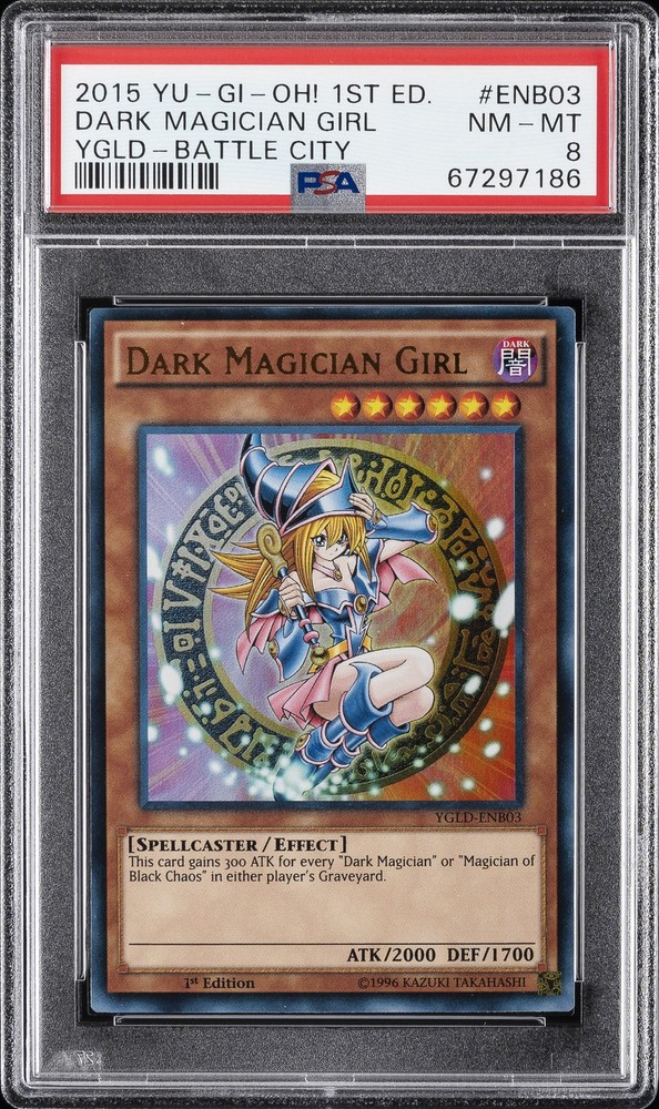 2015 YU-GI-OH! YUGI'S LEGENDARY DECK: BATTLE CITY 1ST EDITION #ENB03 DARK MAGICIAN GIRL PSA 8 2015 YU-GI-OH! YUGI'S LEGENDARY DECK: BATTLE CITY 1ST EDITION #ENB03 DARK MAGICIAN GIRL PSA 8 Purchase Info Thank you for your interest in this item consigned with PSA! By purchasing or making an offer on this item, you acknowledge and agree to the following terms: All sales are final. Returns not accepted. Payment must be made upon purchase of the item. All items are sold "as is" and without warranty of Collectors Universe, Inc. (d/b/a PSA), and ANY AND ALL IMPLIED WARRANTIES ARE DISCLAIMED AND EXCLUDED. Sales tax may apply depending on shipping address. PSA does not guarantee that another third-party grading company's authentication or certification of an item as genuine is correct or accurate. Neither a difference of opinion between third-party grading companies about authenticity, nor a company's subsequent reversal of its earlier authentication or certification of an item, will be a basis for rescinding a sale. Any dispute with another third-party grading company relating to the authenticity of an item must be resolved directly with that other company. Collectors' maximum liability in the event of loss or damage to an item during shipping will be the lesser of (a) the price paid for the item and (b) the change in fair market value of the item. You release Collectors from all other liability including for any claims of punitive damages, emotional distress, consequential damages, lost profits, or lost interest, except as prohibited by law. Shipping Purchased Items will be shipped directly from PSA Vault. You stay hands-free. PSA Vault When you purchase this item, you can save on sales tax and selling fees by keeping it in the PSA Vault, official Vault of eBay. Items already in PSA Vault and will be sent to PSA Vault will have no shipping charge Storage of any items with the PSA Vault will be subject to the PSA Vault Terms of Service. Consignment PSA has competitive rates on the world's largest collectibles marketplace with the option to list from the PSA Vault or immediately after PSA authentication and grading. Sale Price Under $100 $100 - $499 $500 - $999 $1,000 - $2,499 $2,500 - $4,999 $5,000+ Seller Fee 16% 14% 13% 10% 9% 7% Sellers pay a single fee as reflected above; no additional eBay fees are incurred. There is a $5 minimum fee on sold items.
