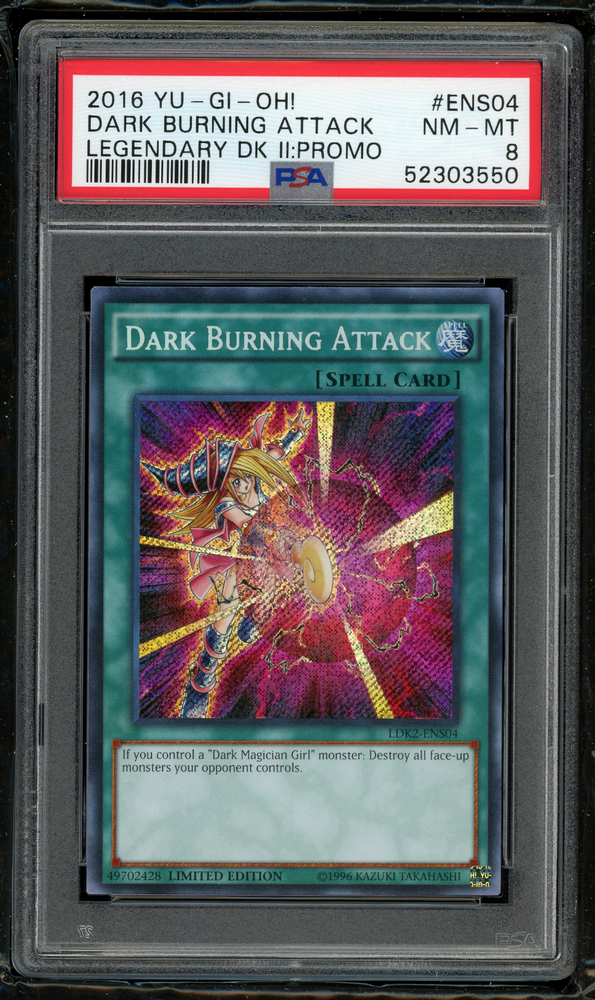 Hi, up for sale is a freshly slabbed, 2016 YU-GI-OH! LEGENDARY DECK II ENS04 DARK BURNING ATTACK PROMO -Secret Rare . The card has been professionally graded by PSA Near Mint-Mint 8! This is a rare card in any grade as there are only 32 finer. This is a 10 population! Perfect for any fan of the Anime, TCG, Duelist Kingdom/Battle City arc of the series, Yugi Muto, Dark Magician Girl, Dark Magician, or the Yu-Gi-Oh Spellcasters. A true trophy piece, and can fit nicely into any display case. A great way to start your PSA Yu-Gi-Oh!/Dark Magician Girl Collection or just simply, add to it. Serious Best Offers will be entertained. However, if you do use this feature payment is due promptly. I list a 2 day handling time for the item, but usually ship the same day whenever I can. Plus, Your item will be shipped in a box and fully protected. To see all of my items listed, simply go into my seller page, and filter by "newly listed or ending soonest". Thanks again. Good luck and don't let this one pass you by!