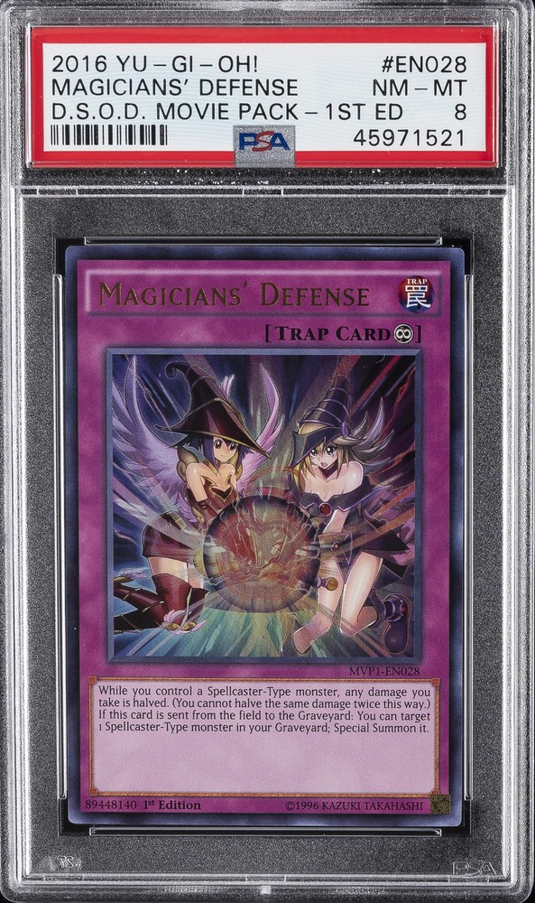 2016 YU-GI-OH! THE DARK SIDE OF DIMENSIONS MOVIE PACK 1ST EDITION #EN028 MAGICIANS' DEFENSE PSA 8 2016 YU-GI-OH! THE DARK SIDE OF DIMENSIONS MOVIE PACK 1ST EDITION #EN028 MAGICIANS' DEFENSE PSA 8 Purchase Info Thank you for your interest in this item consigned with PSA! By purchasing or making an offer on this item, you acknowledge and agree to the following terms: All sales are final. Returns not accepted. Payment must be made upon purchase of the item. All items are sold "as is" and without warranty of Collectors Universe, Inc. (d/b/a PSA), and ANY AND ALL IMPLIED WARRANTIES ARE DISCLAIMED AND EXCLUDED. Sales tax may apply depending on shipping address. PSA does not guarantee that another third-party grading company's authentication or certification of an item as genuine is correct or accurate. Neither a difference of opinion between third-party grading companies about authenticity, nor a company's subsequent reversal of its earlier authentication or certification of an item, will be a basis for rescinding a sale. Any dispute with another third-party grading company relating to the authenticity of an item must be resolved directly with that other company. Collectors' maximum liability in the event of loss or damage to an item during shipping will be the lesser of (a) the price paid for the item and (b) the change in fair market value of the item. You release Collectors from all other liability including for any claims of punitive damages, emotional distress, consequential damages, lost profits, or lost interest, except as prohibited by law. Shipping Purchased Items will be shipped directly from PSA Vault. You stay hands-free. PSA Vault When you purchase this item, you can save on sales tax and selling fees by keeping it in the PSA Vault, official Vault of eBay. Items already in PSA Vault and will be sent to PSA Vault will have no shipping charge Storage of any items with the PSA Vault will be subject to the PSA Vault Terms of Service. Consignment PSA has competitive rates on the world's largest collectibles marketplace with the option to list from the PSA Vault or immediately after PSA authentication and grading. Sale Price Under $100 $100 - $499 $500 - $999 $1,000 - $2,499 $2,500 - $4,999 $5,000+ Seller Fee 16% 14% 13% 10% 9% 7% Sellers pay a single fee as reflected above; no additional eBay fees are incurred. There is a $5 minimum fee on sold items.