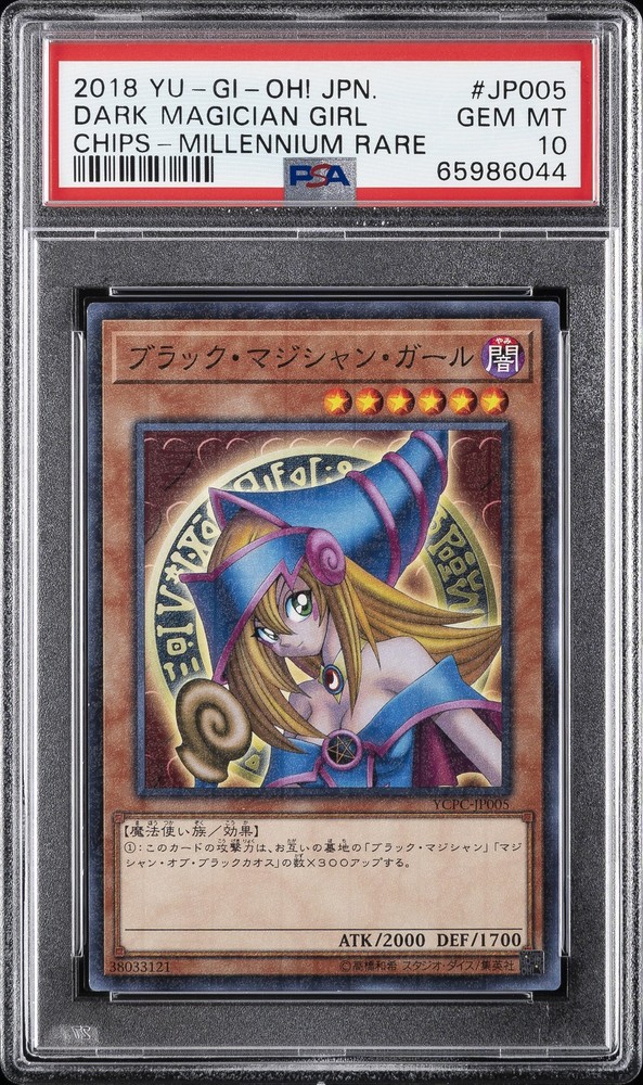 2018 YU-GI-OH! JAPANESE CHIPS MILLENNIUM RARE #JP005 DARK MAGICIAN GIRL PSA 10 2018 YU-GI-OH! JAPANESE CHIPS MILLENNIUM RARE #JP005 DARK MAGICIAN GIRL PSA 10 Purchase Info Thank you for your interest in this item consigned with PSA! By purchasing or making an offer on this item, you acknowledge and agree to the following terms: All sales are final. Returns not accepted. Payment must be made upon purchase of the item. All items are sold "as is" and without warranty of Collectors Universe, Inc. (d/b/a PSA), and ANY AND ALL IMPLIED WARRANTIES ARE DISCLAIMED AND EXCLUDED. Sales tax may apply depending on shipping address. PSA does not guarantee that another third-party grading company's authentication or certification of an item as genuine is correct or accurate. Neither a difference of opinion between third-party grading companies about authenticity, nor a company's subsequent reversal of its earlier authentication or certification of an item, will be a basis for rescinding a sale. Any dispute with another third-party grading company relating to the authenticity of an item must be resolved directly with that other company. Collectors' maximum liability in the event of loss or damage to an item during shipping will be the lesser of (a) the price paid for the item and (b) the change in fair market value of the item. You release Collectors from all other liability including for any claims of punitive damages, emotional distress, consequential damages, lost profits, or lost interest, except as prohibited by law. Shipping Purchased Items will be shipped directly from PSA Vault. You stay hands-free. PSA Vault When you purchase this item, you can save on sales tax and selling fees by keeping it in the PSA Vault, official Vault of eBay. Items already in PSA Vault and will be sent to PSA Vault will have no shipping charge Storage of any items with the PSA Vault will be subject to the PSA Vault Terms of Service. Consignment PSA has competitive rates on the world's largest collectibles marketplace with the option to list from the PSA Vault or immediately after PSA authentication and grading. Sale Price Under $100 $100 - $499 $500 - $999 $1,000 - $2,499 $2,500 - $4,999 $5,000+ Seller Fee 16% 14% 13% 10% 9% 7% Sellers pay a single fee as reflected above; no additional eBay fees are incurred. There is a $5 minimum fee on sold items.