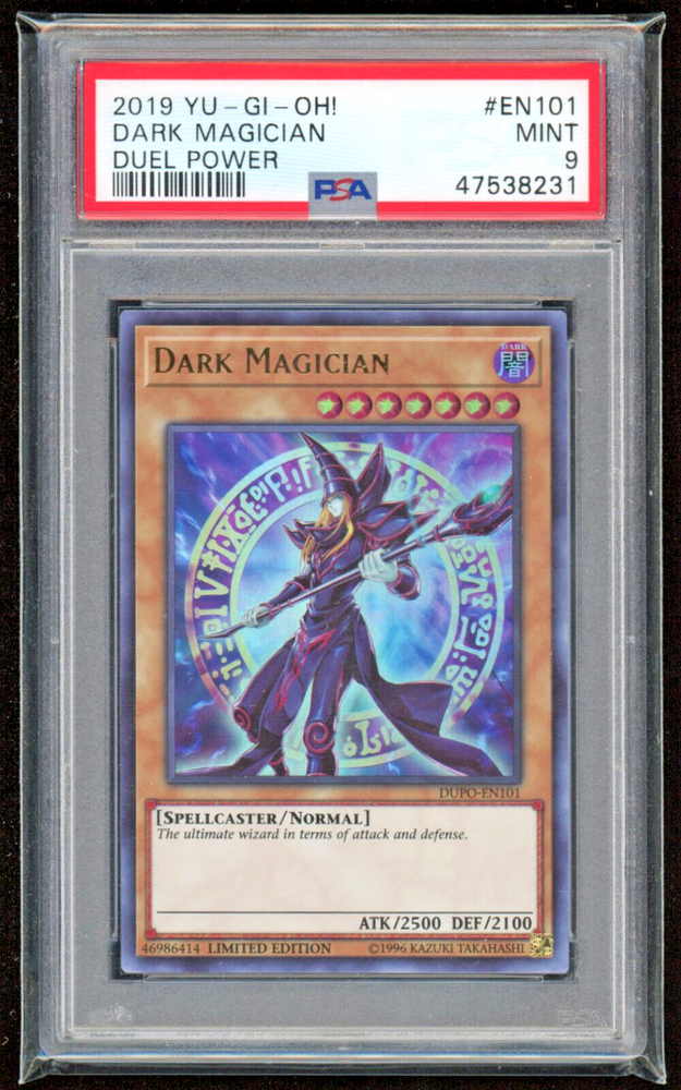 YU-GI-OH! TRADING CARD GAME (YTCG) BY KONAMI The Yu-Gi-Oh! Trading Card Game was launched by Konami in 1999 in Japan and March 2002 in North America . It was named the top selling trading card game in the world by Guiness World Records on July 7, 2009, having sold over 22 billion cards worldwide. As of March 31, 2011, Konami Digital Entertainment Co., Ltd. Japan sold 25.2 billion cards globally since 1999. As of January 2021, the game is estimated to have sold about 35 billion cards worldwide and grossed over ¥1 trillion ( $9.64 billion ). Yu-Gi-Oh! Speed Duel, a faster and simplified version of the game, was launched worldwide in January 2019. Another faster-paced variation, Yu-Gi-Oh! Rush Duel, launched in Japan in April 2020. DARK MAGICIAN 2019 DUEL POWER #EN101 PROFESSIONAL SPORTS AUTHENTICATOR / (PSA): GRADE 9 CONDITION: MINT RELEASE DATE: 2019 YU-GI-OH! TRADING CARD GAME / (YTCG) PROFESSIONAL SPORTS AUTHENTICATOR (PSA) Professional Sports Authenticator was launched in July 1991 by David Hall , owner of the coin grading company Professional Coin Grading Service, to serve collectors as a third-party card grader. When they started, they struggled as a business, due to a low demand of collectors wanting their cards to be graded. A lot of sports card dealers were against the idea of having a third-party grade their cards, and decided against using card grading as a benefit to their business. Eventually, the market quickly shifted towards wanting cards graded, due to a prevalent amount of dishonesty at trade shows. Customers rarely felt comfortable with a purchase, and always felt as though it was a gamble if they were getting a real card, and not a fake. A third-party grading company started to make sense; a party that had no financial influence in telling you the honest grade of a card. Having a card graded gave peace of mind to customers, who can buy a card with confidence knowing it was a legitimate card, instead of believing the dealer's biased opinion on what the grade of the card is.