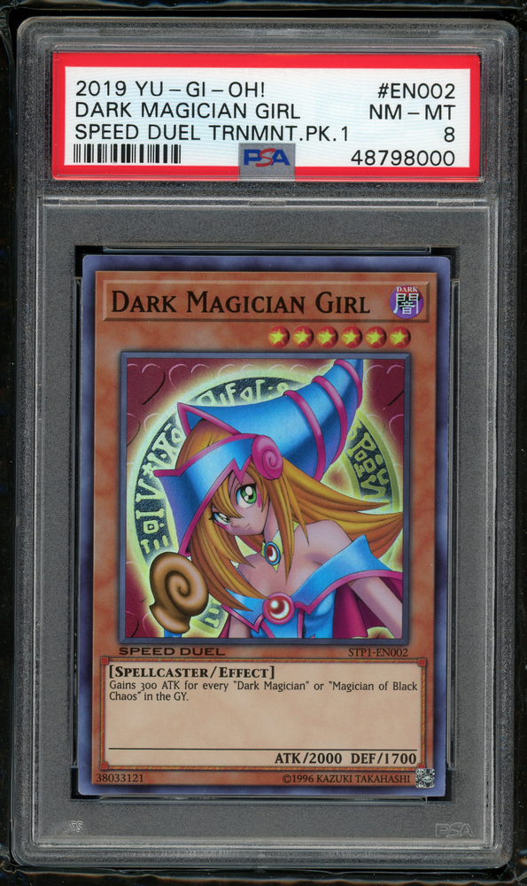Hi, up for sale is a freshly slabbed, 2019 YU-GI-OH! SPEED DUEL TOURNAMENT PACK 1 EN002 DARK MAGICIAN GIRL -Speed Duel Super Rare . The card has been professionally graded by PSA Near Mint-Mint 8! This is a rare card in any grade as there are only 279 finer. This is a 1/29 population! Perfect for any fan of the Anime, TCG, Speed Duel, Duelist Kingdom/Battle City arc of the series, Yugi Muto, Dark Magician/Girl or the Yu-Gi-Oh Spellcasters. A true trophy piece, from the Golden Era of Yu-Gi-Oh and quite possibly, one of the, if not the most sought after monster(s) in all of Yu-Gi-Oh!;featuring her original Magician's Force art and from the original Speed Duel Tournament Pack. These cards are different than the original cards, as the are thicker, Glossier, and have a stamped speed duel in the flavor text. Also, can fit nicely into any display case. A great way to start your PSA Yu-Gi-Oh!/Dark Magician Girl/Speed Duel Collection or just simply, add to it. Serious Best Offers will be entertained. However, if you do use this feature payment is due promptly. I list a 3 day handling time for the item, but usually ship the same day whenever I can. Plus, Your item will be shipped in a box and fully protected. To see all of my items listed, simply go into my seller page, and filter by "newly listed or ending soonest". Thanks again. Good luck and don't let this one pass you by!