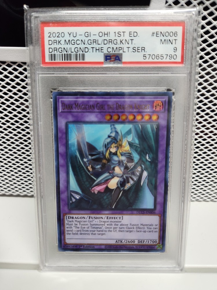 This rare Dark Magician Girl The Dragon Knight card from the Dragons of Legend set is a must-have for any Yu-Gi-Oh! TCG fan. The card features a beautiful holo finish, making it a standout addition to any collection. It is a 1st edition card, professionally graded as PSA 9, ensuring its authenticity and quality. The card is in excellent shape and is perfect for collectors.