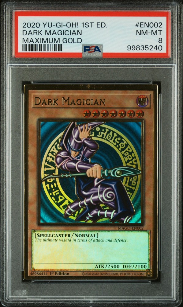 2020 YU-GI-OH! MAXIMUM GOLD 1ST EDITION #EN002 DARK MAGICIAN PSA 8 2020 YU-GI-OH! MAXIMUM GOLD 1ST EDITION #EN002 DARK MAGICIAN PSA 8 Purchase Info Thank you for your interest in this item consigned with PSA! By purchasing or making an offer on this item, you acknowledge and agree to the following terms: All sales are final. Returns not accepted. Payment must be made upon purchase of the item. All items are sold "as is" and without warranty of Collectors Universe, Inc. (d/b/a PSA), and ANY AND ALL IMPLIED WARRANTIES ARE DISCLAIMED AND EXCLUDED. Sales tax may apply depending on shipping address. PSA does not guarantee that another third-party grading company's authentication or certification of an item as genuine is correct or accurate. Neither a difference of opinion between third-party grading companies about authenticity, nor a company's subsequent reversal of its earlier authentication or certification of an item, will be a basis for rescinding a sale. Any dispute with another third-party grading company relating to the authenticity of an item must be resolved directly with that other company. Collectors' maximum liability in the event of loss or damage to an item during shipping will be the lesser of (a) the price paid for the item and (b) the change in fair market value of the item. You release Collectors from all other liability including for any claims of punitive damages, emotional distress, consequential damages, lost profits, or lost interest, except as prohibited by law. Shipping Purchased Items will be shipped directly from PSA Vault. You stay hands-free. PSA Vault When you purchase this item, you can save on sales tax and selling fees by keeping it in the PSA Vault, official Vault of eBay. Items already in PSA Vault and will be sent to PSA Vault will have no shipping charge Storage of any items with the PSA Vault will be subject to the PSA Vault Terms of Service. Consignment PSA has competitive rates on the world's largest collectibles marketplace with the option to list from the PSA Vault or immediately after PSA authentication and grading. Sale Price Under $100 $100 - $499 $500 - $999 $1,000 - $2,499 $2,500 - $4,999 $5,000+ Seller Fee 16% 14% 13% 10% 9% 7% Sellers pay a single fee as reflected above; no additional eBay fees are incurred. There is a $5 minimum fee on sold items.