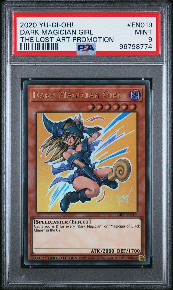 2020 YU-GI-OH! THE LOST ART PROMOTION #EN019 DARK MAGICIAN GIRL PSA 9 2020 YU-GI-OH! THE LOST ART PROMOTION #EN019 DARK MAGICIAN GIRL PSA 9 Purchase Info Thank you for your interest in this item consigned with PSA! By purchasing or making an offer on this item, you acknowledge and agree to the following terms: All sales are final. Returns not accepted. Payment must be made upon purchase of the item. All items are sold "as is" and without warranty of Collectors Universe, Inc. (d/b/a PSA), and ANY AND ALL IMPLIED WARRANTIES ARE DISCLAIMED AND EXCLUDED. Sales tax may apply depending on shipping address. PSA does not guarantee that another third-party grading company's authentication or certification of an item as genuine is correct or accurate. Neither a difference of opinion between third-party grading companies about authenticity, nor a company's subsequent reversal of its earlier authentication or certification of an item, will be a basis for rescinding a sale. Any dispute with another third-party grading company relating to the authenticity of an item must be resolved directly with that other company. Collectors' maximum liability in the event of loss or damage to an item during shipping will be the lesser of (a) the price paid for the item and (b) the change in fair market value of the item. You release Collectors from all other liability including for any claims of punitive damages, emotional distress, consequential damages, lost profits, or lost interest, except as prohibited by law. Shipping Purchased Items will be shipped directly from PSA Vault. You stay hands-free. PSA Vault When you purchase this item, you can save on sales tax and selling fees by keeping it in the PSA Vault, official Vault of eBay. Items already in PSA Vault and will be sent to PSA Vault will have no shipping charge Storage of any items with the PSA Vault will be subject to the PSA Vault Terms of Service. Consignment PSA has competitive rates on the world's largest collectibles marketplace with the option to list from the PSA Vault or immediately after PSA authentication and grading. Sale Price Under $100 $100 - $499 $500 - $999 $1,000 - $2,499 $2,500 - $4,999 $5,000+ Seller Fee 16% 14% 13% 10% 9% 7% Sellers pay a single fee as reflected above; no additional eBay fees are incurred. There is a $5 minimum fee on sold items.
