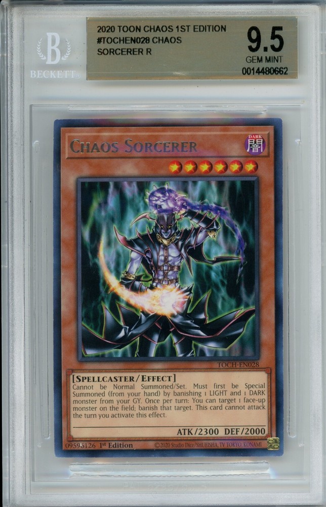 Up for sale is a 2020 Yu-Gi-Oh! Toon Chaos 1st Edition Chaos Sorcerer #TOCH-EN028 Rare card. This card has been graded 9.5 by Beckett Grading Services (BGS) and features the iconic Chaos Sorcerer character. It is a single-parallel card, manufactured by Konami and is part of the Yu-Gi-Oh! TCG game. This original card is a great addition to any Yu-Gi-Oh! card collection and is perfect for fans of the Chaos Sorcerer character. It is a rare find and comes with 1st Edition features. Don't miss out on the opportunity to own this valuable and sought-after card.