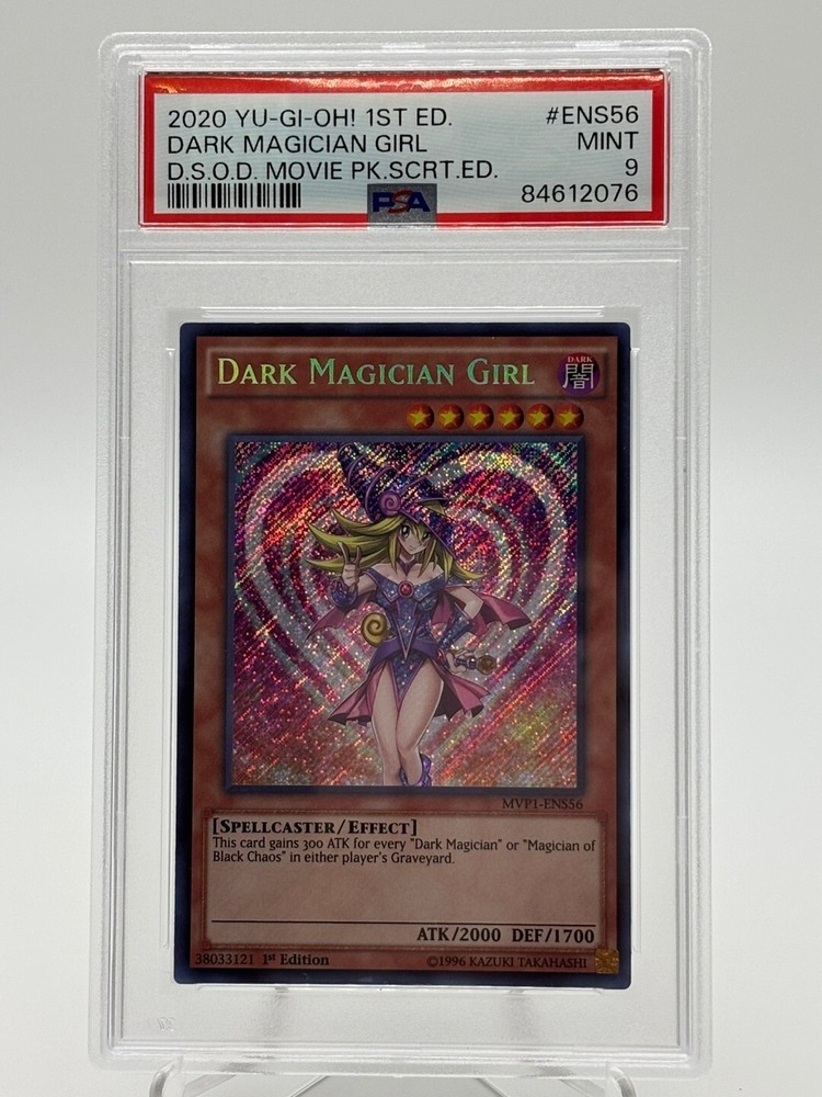 Explore the mystical world of Yu-Gi-Oh! with the Dark Magician Girl card from the The Dark Side of Dimensions Movie Pack Secret Edition. This sought-after collectible, featuring the iconic Darkness attribute, is a must-have for any serious duelist or collector. Card number 56, known as ENS56, has been meticulously preserved and rated a PSA 9, ensuring its premium quality. Crafted by Konami and printed in English, this standard-sized card boasts a striking illustration of the beloved Dark Magician Girl, making it an eye-catching addition to any collection. Suitable for age 6 and up, it's a fantastic find for both young and seasoned fans of the Yu-Gi-Oh! TCG.